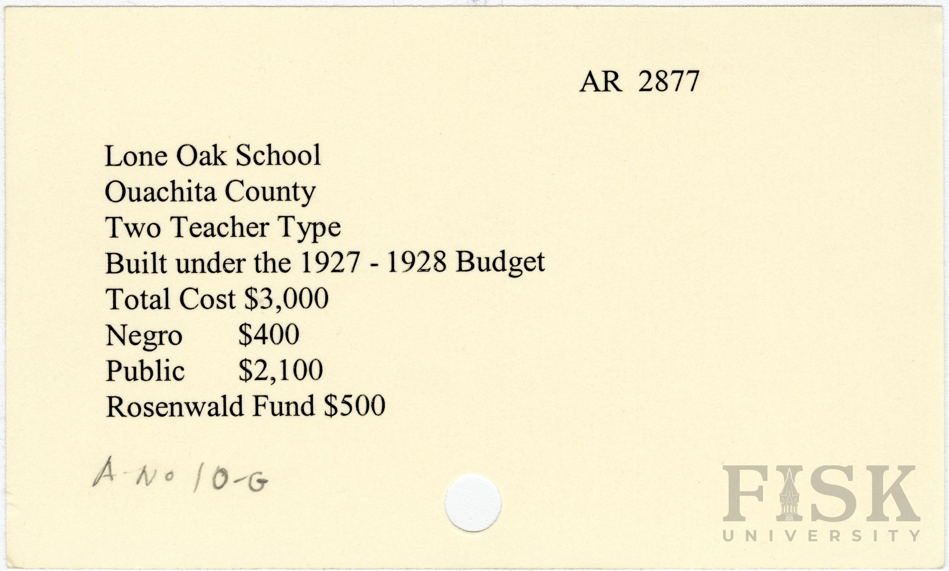 - School card from Rosenwald Fund for Lone Oak School in Ouachita County, Arkansas