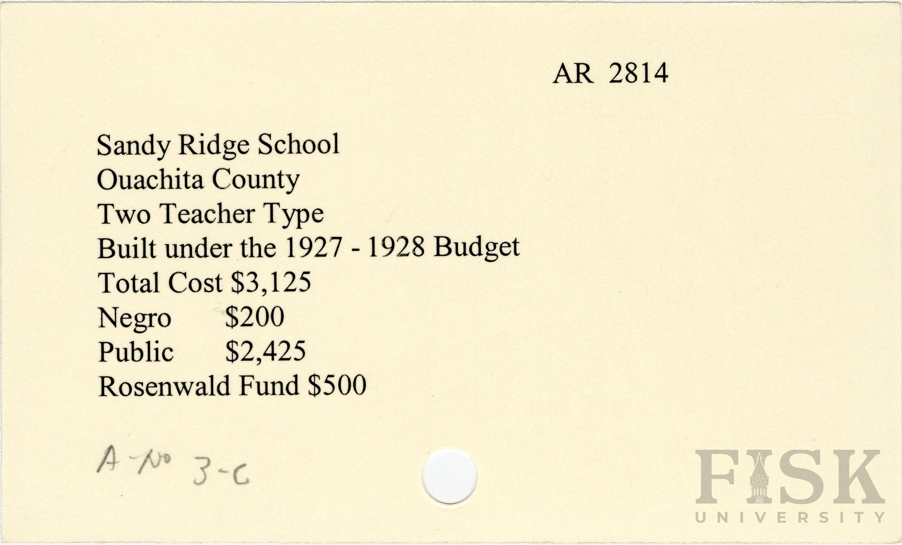 - School card from Rosenwald Fund for Sandy Ridge School in Ouachita County, Arkansas
