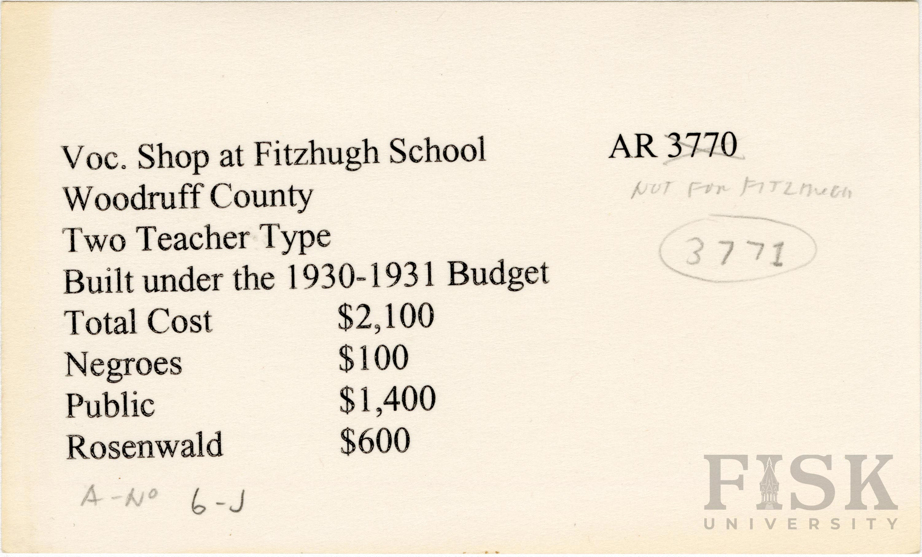 - School card from Rosenwald Fund for the vocational shop at Fitzhugh School in Woodruff County, Arkansas with a handwritten correction to the item number