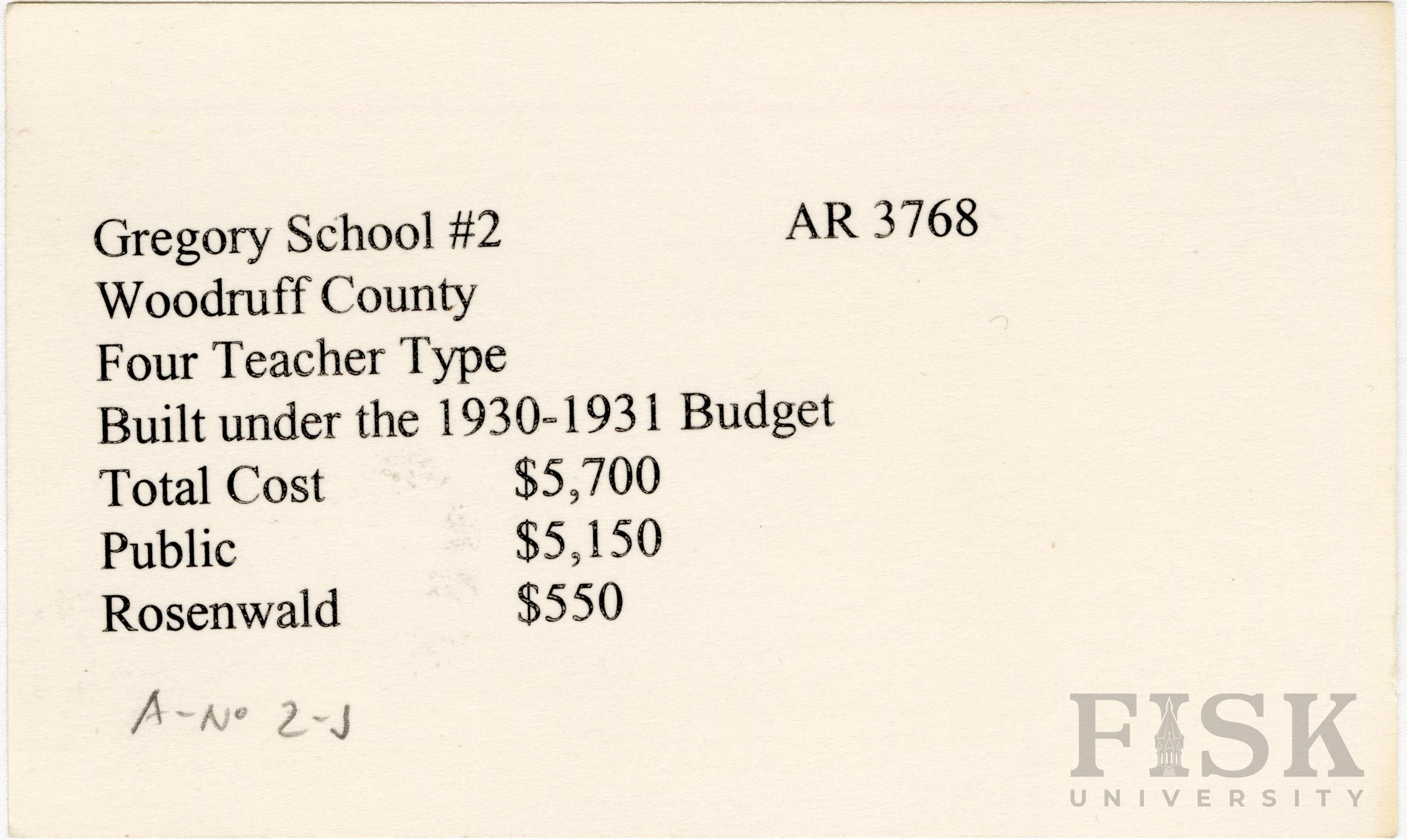 - School card from Rosenwald Fund for Gregory School No. 2 in Woodruff County, Arkansas