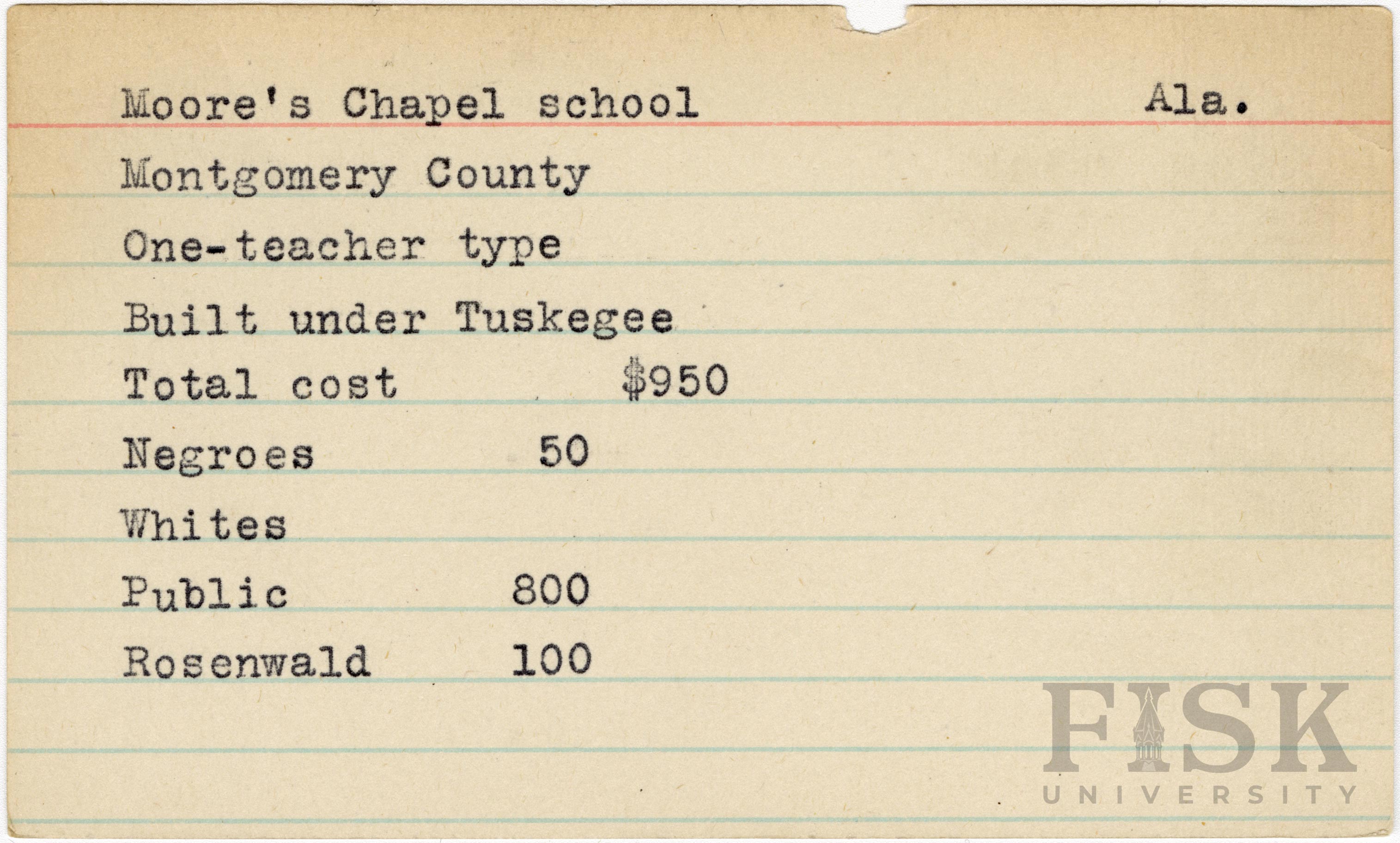 - School card from Rosenwald Fund for Moore's Chapel School in Montgomery County, Alabama