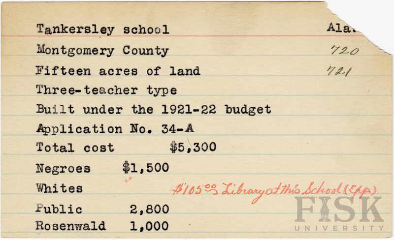 - School card from Rosenwald Fund for Tankersley School in Montgomery County, Alabama with a handwritten note that says, "$105.00 library at this school (Exp)"