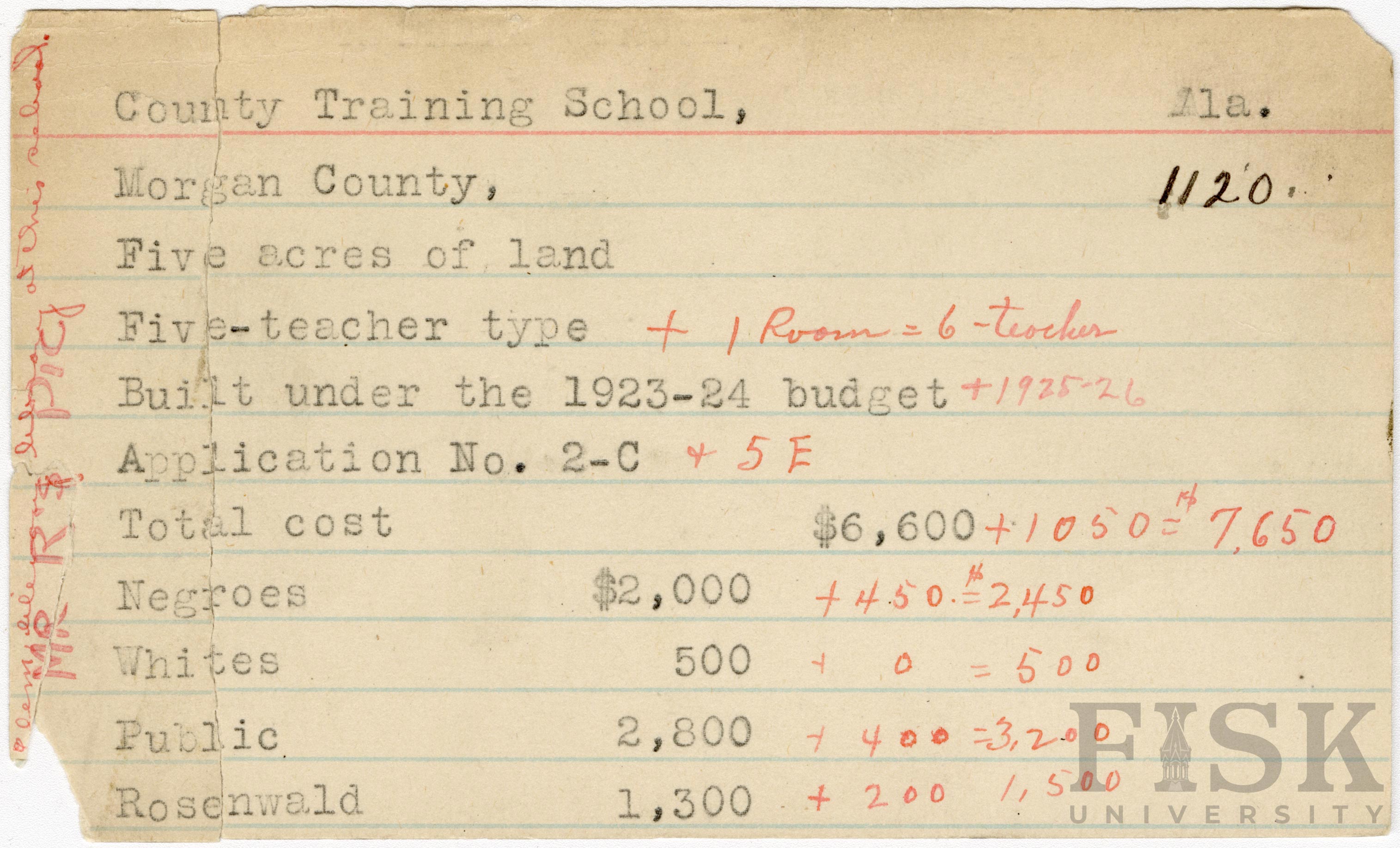 School card from Rosenwald Fund for County Training School in Morgan County, Alabama with handwritten additions to the teacher type, budget year, application number, and budget contribution sections. On the far left, the card says, "Mr. R's Pic" with another handwritten note about a library at the school.