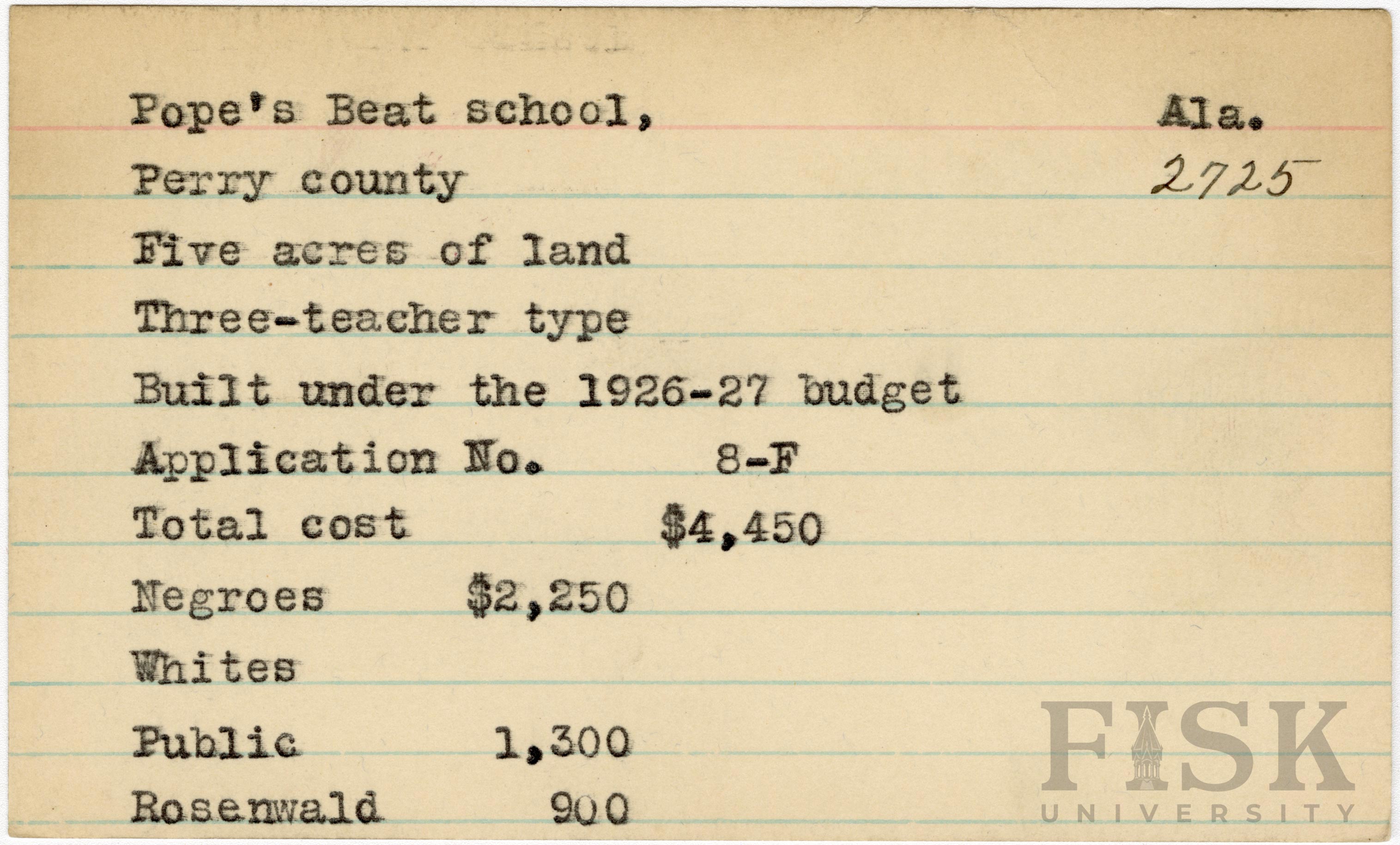 - School card from Rosenwald Fund for Pope's Beat School in Perry County, Alabama