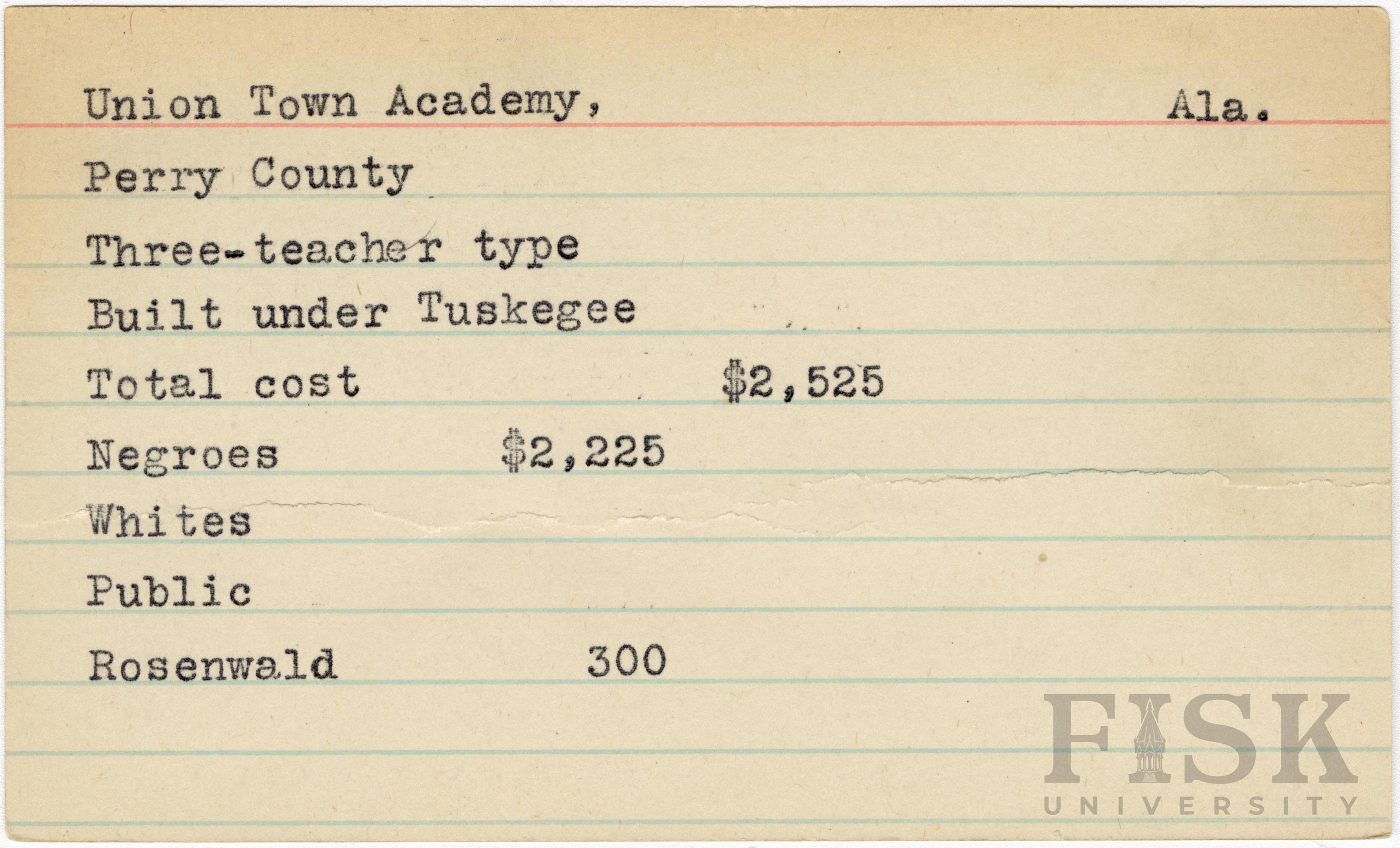 - School card from Rosenwald Fund for Union Town Academy in Perry County, Alabama