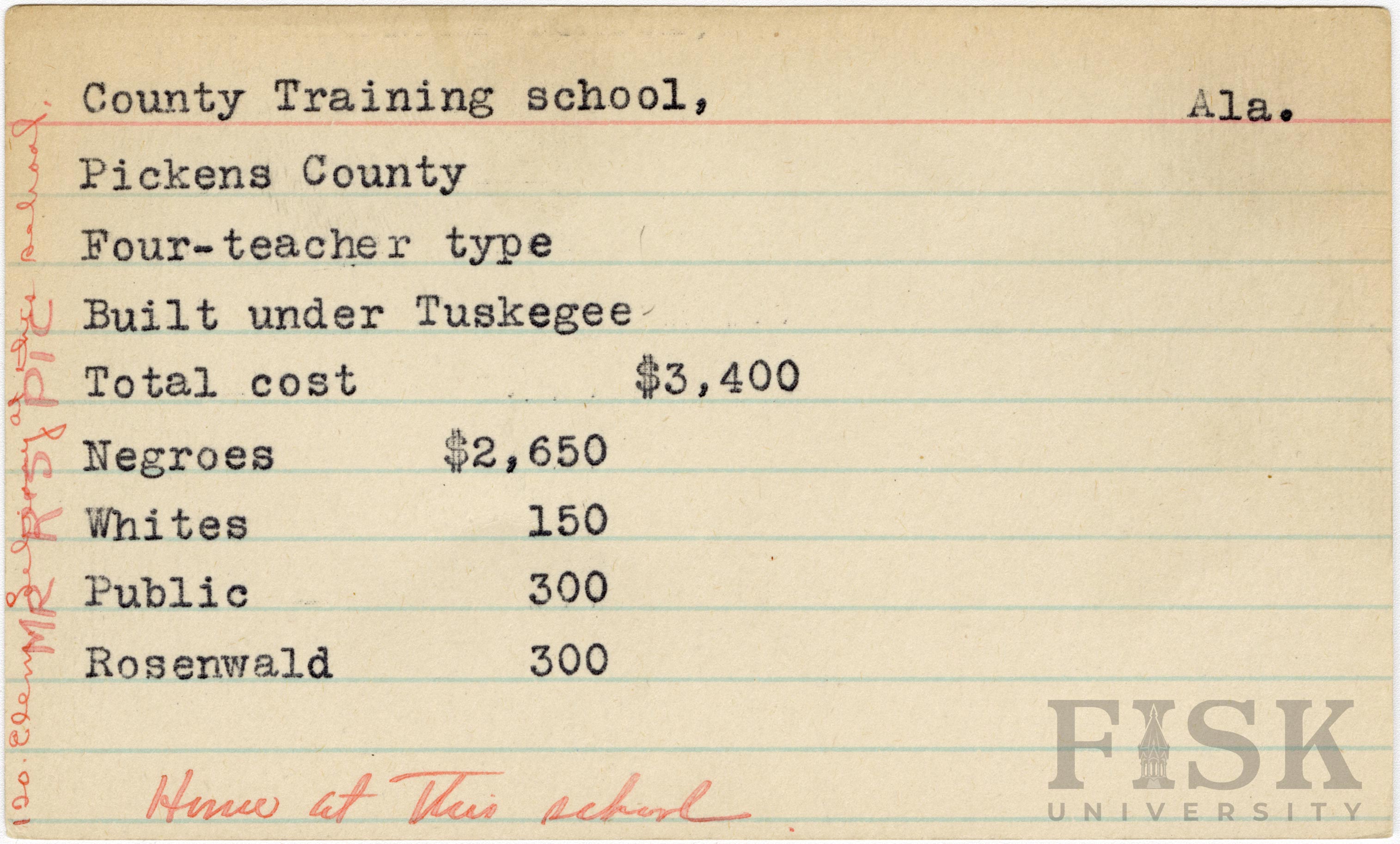 - School card from Rosenwald Fund for County Training School in Pickens County, Alabama with a note on the far left that says, "Mr. R's Pic." A handwritten note at the bottom says "Home at this school." A handwritten note overlapping "Mr. R's Pic" on the far left says, "120 elem library at this school."
