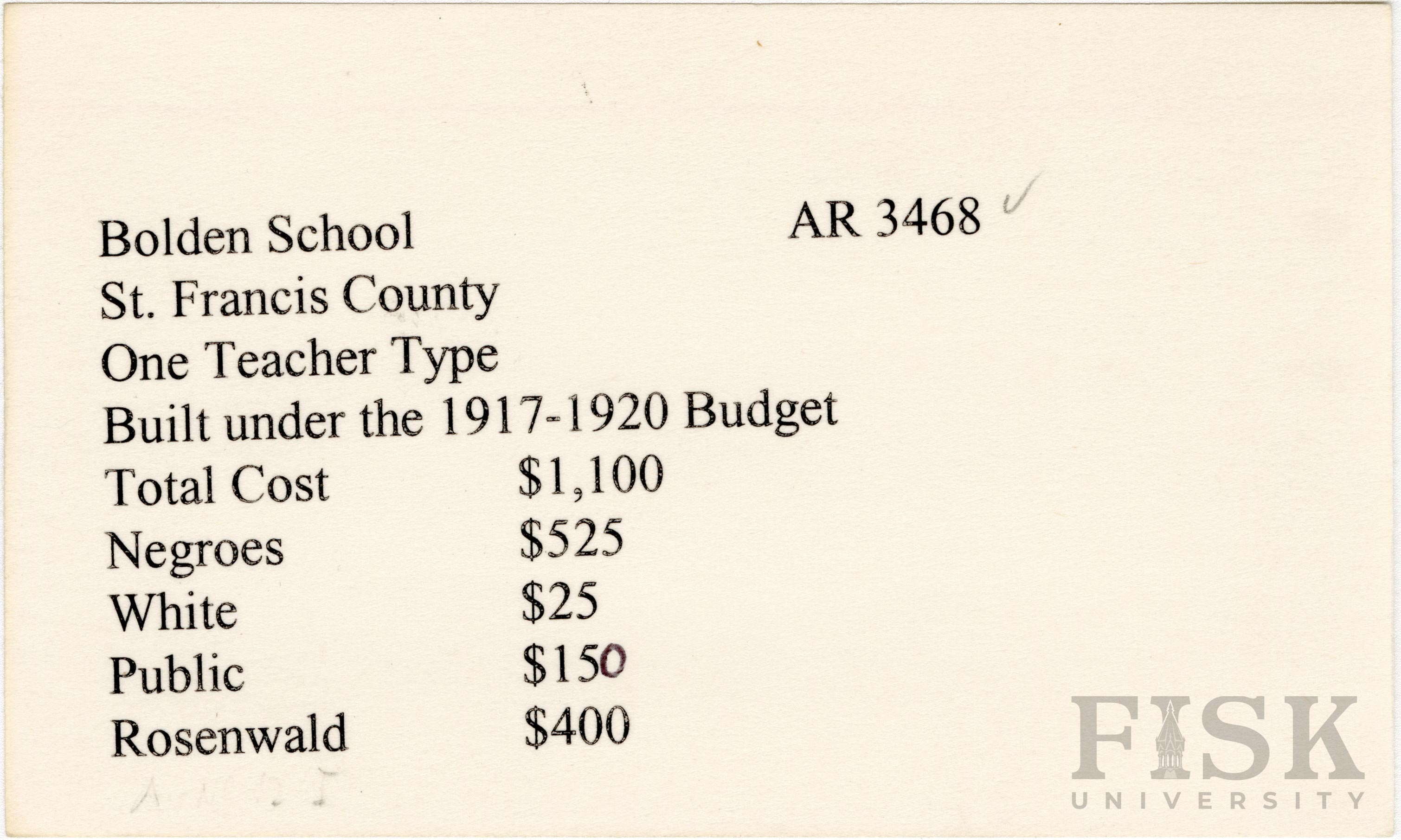 School card from Rosenwald Fund for Bolden School in St. Francis County, Arkansas
