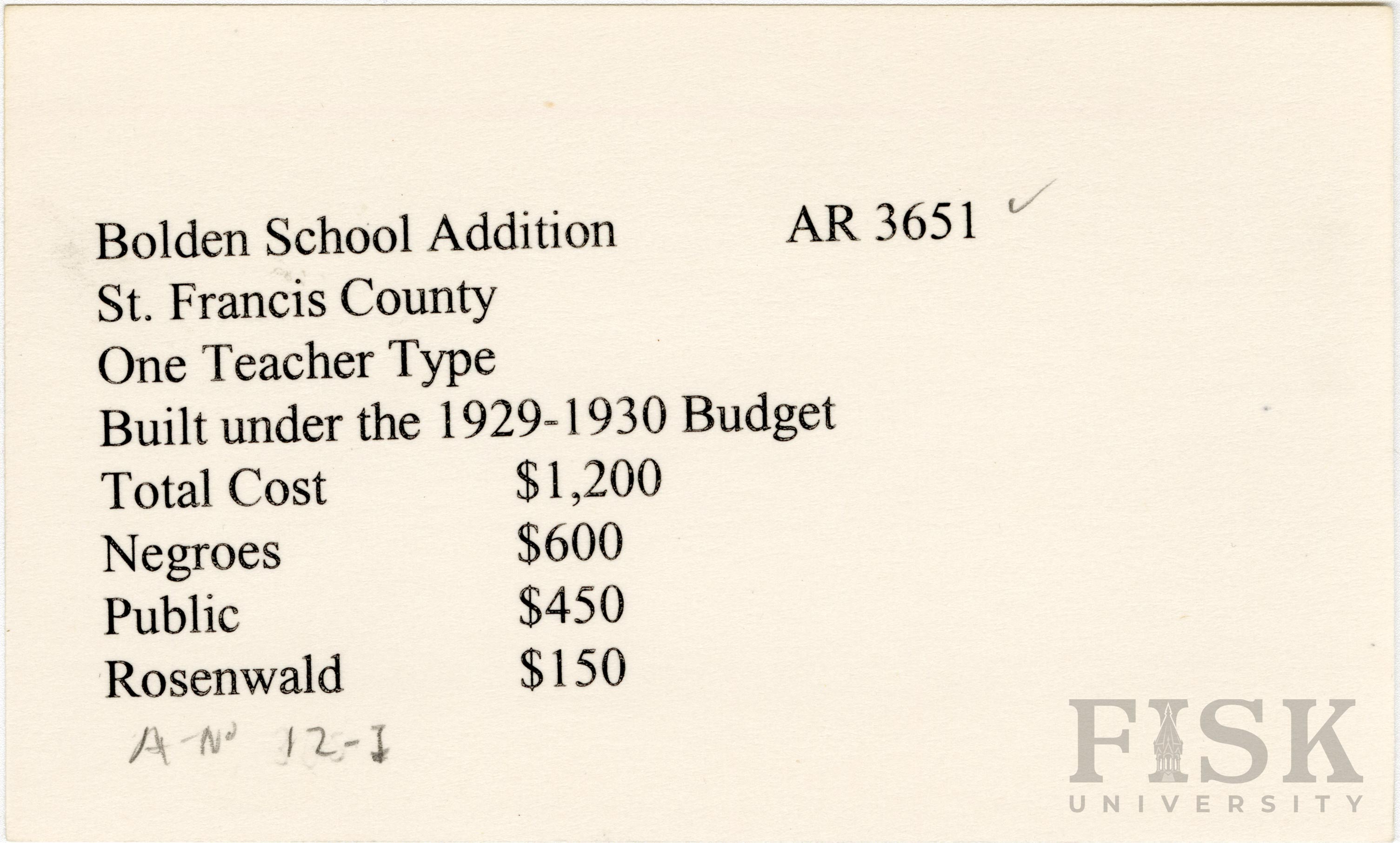 - School card from Rosenwald Fund for an addition to Bolden School in St. Francis County, Arkansas