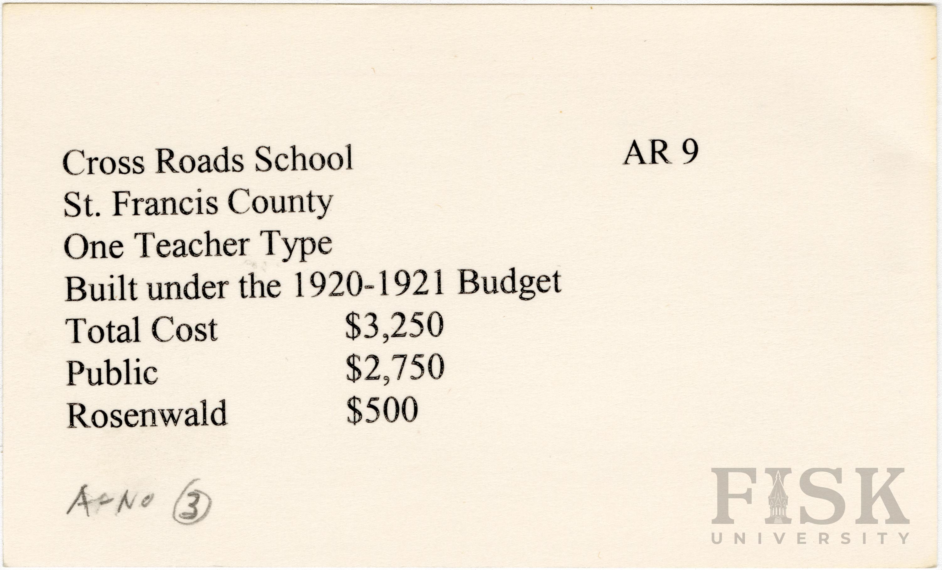 - School card from Rosenwald Fund for Cross Roads School in St. Francis County, Arkansas