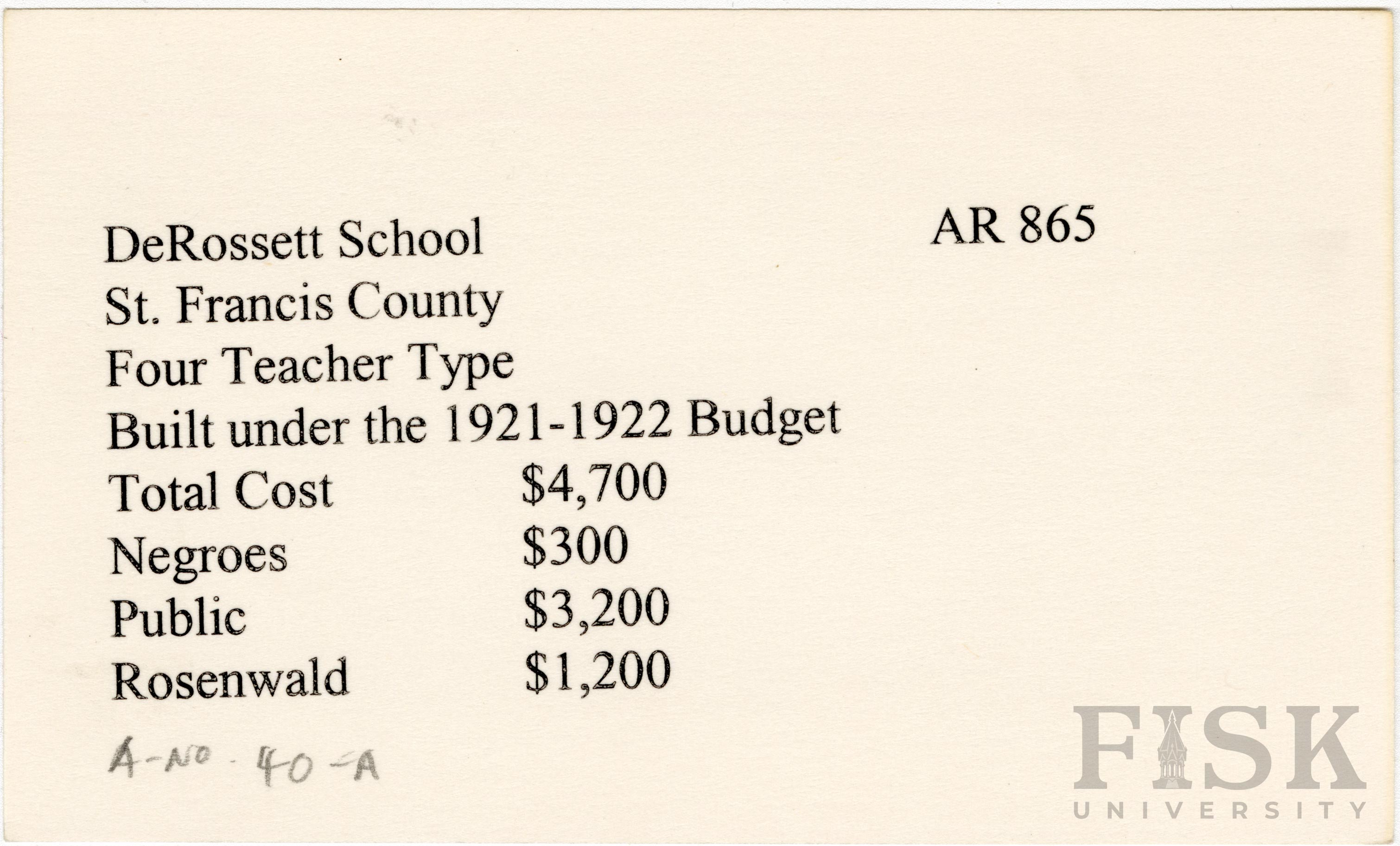 - School card from Rosenwald Fund for DeRossett School in St. Francis County, Arkansas