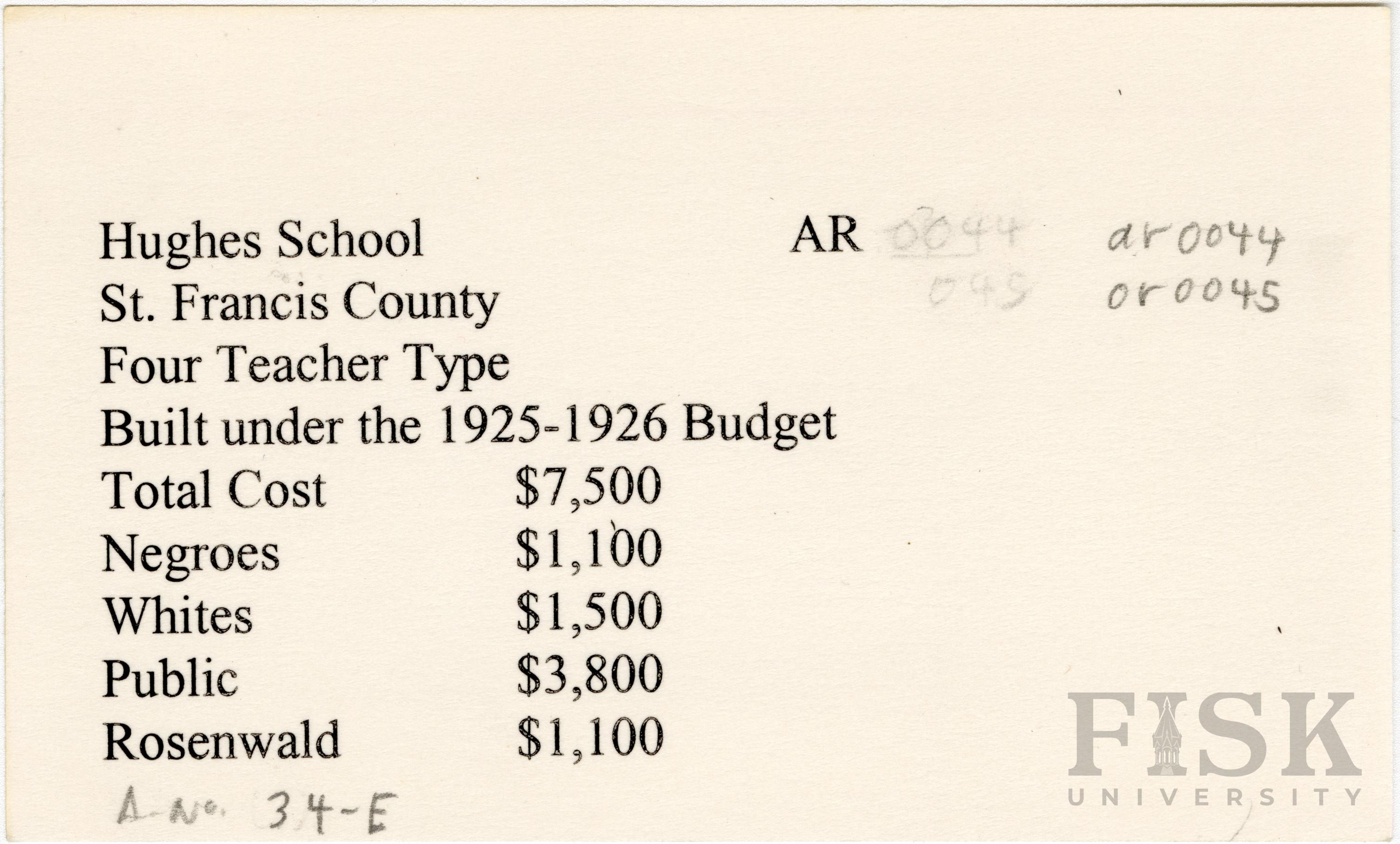 - School card from Rosenwald Fund for Hughes School in St. Francis County, Arkansas