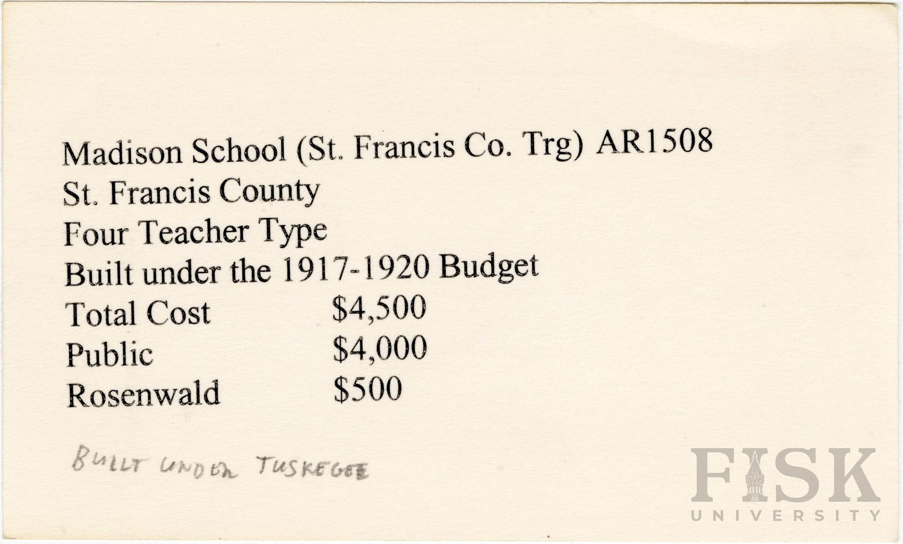- School card from Rosenwald Fund for Madison School in St. Francis County, Arkansas with a note on the card that says, "Built under 1917/1938"