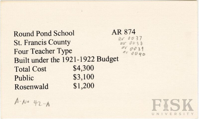 - School card from Rosenwald Fund for Round Pond School in St. Francis County, Arkansas
