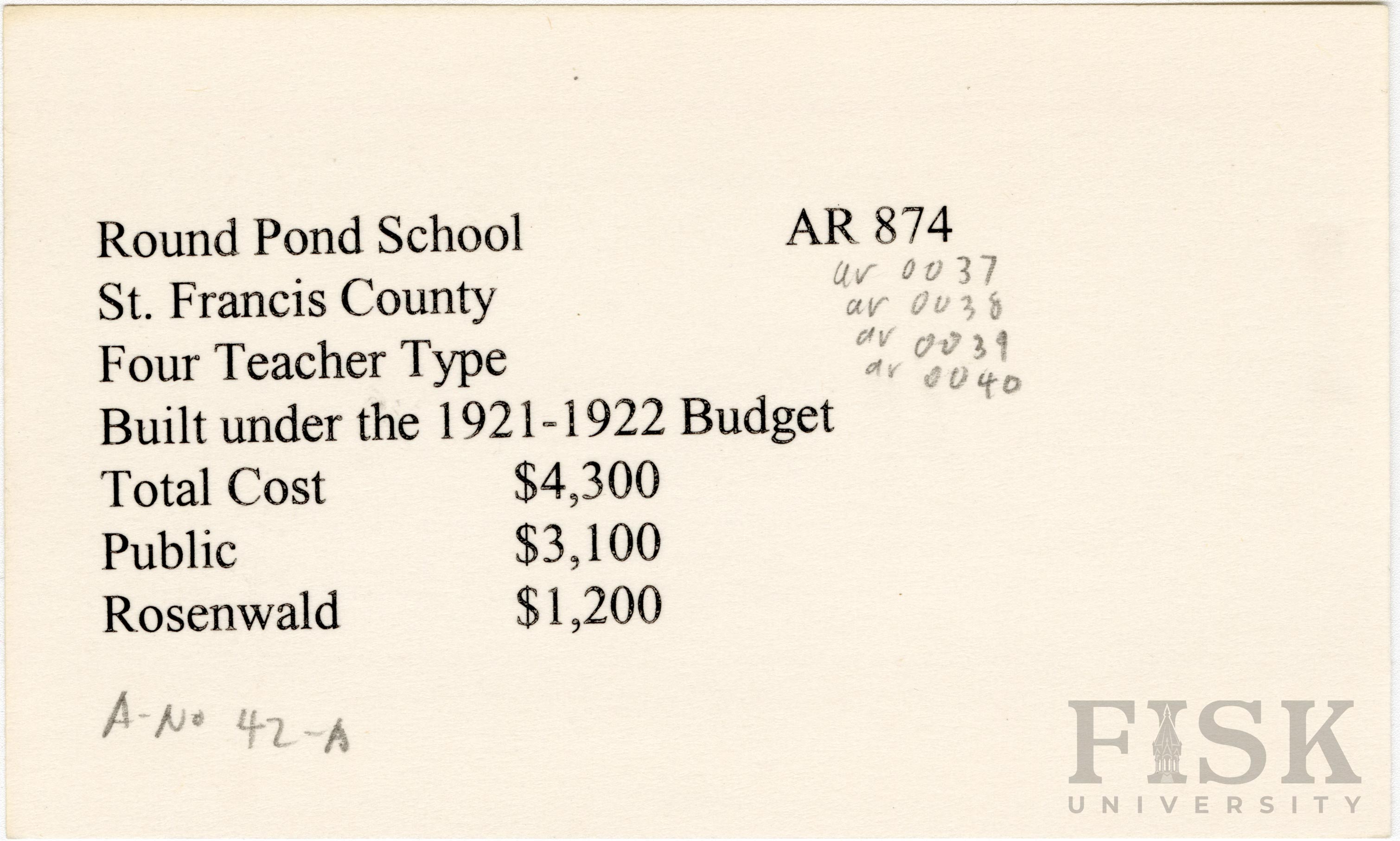 School card from Rosenwald Fund for Round Pond School in St. Francis County, Arkansas