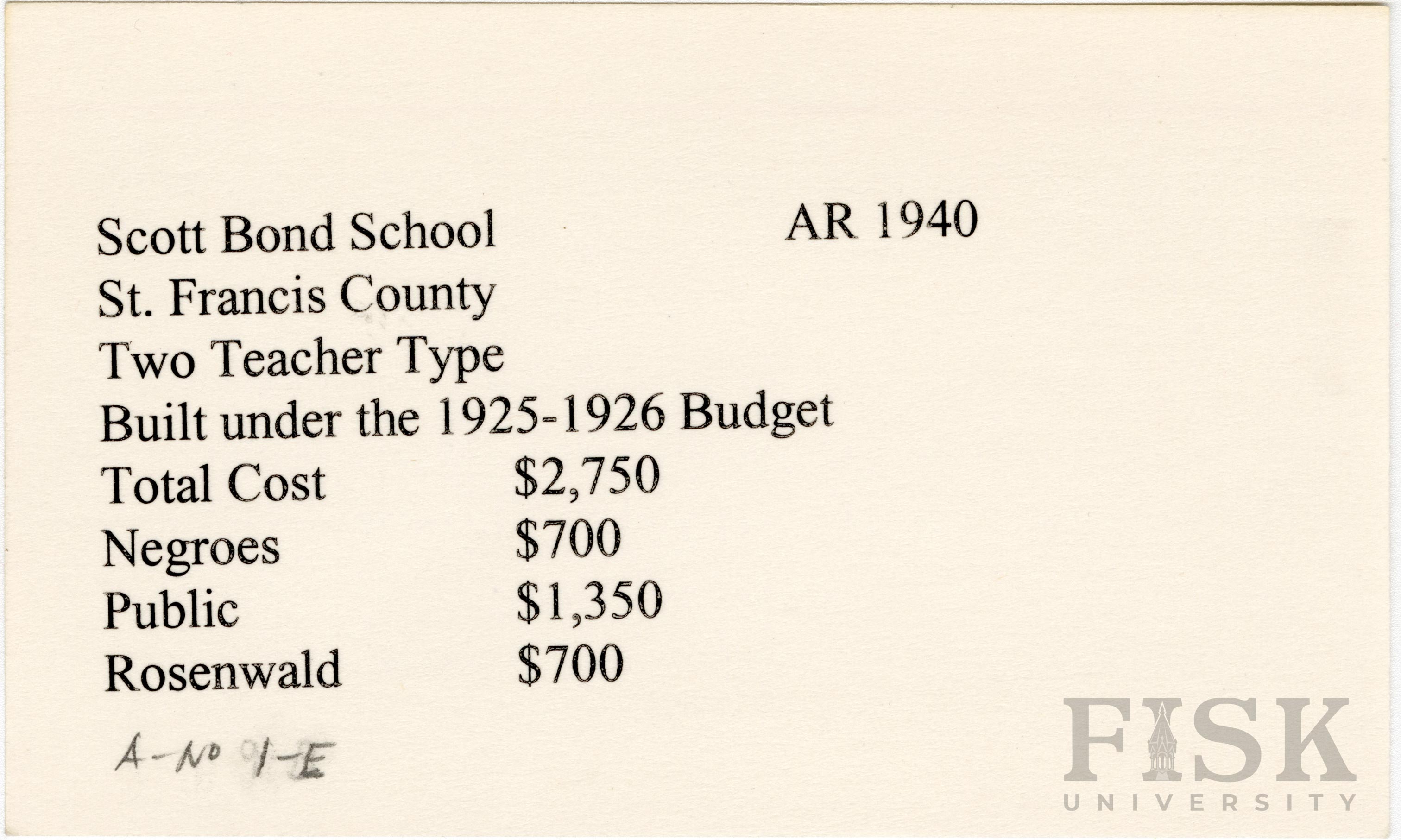 - School card from Rosenwald Fund for Scott Bond School in St. Francis County, Arkansas