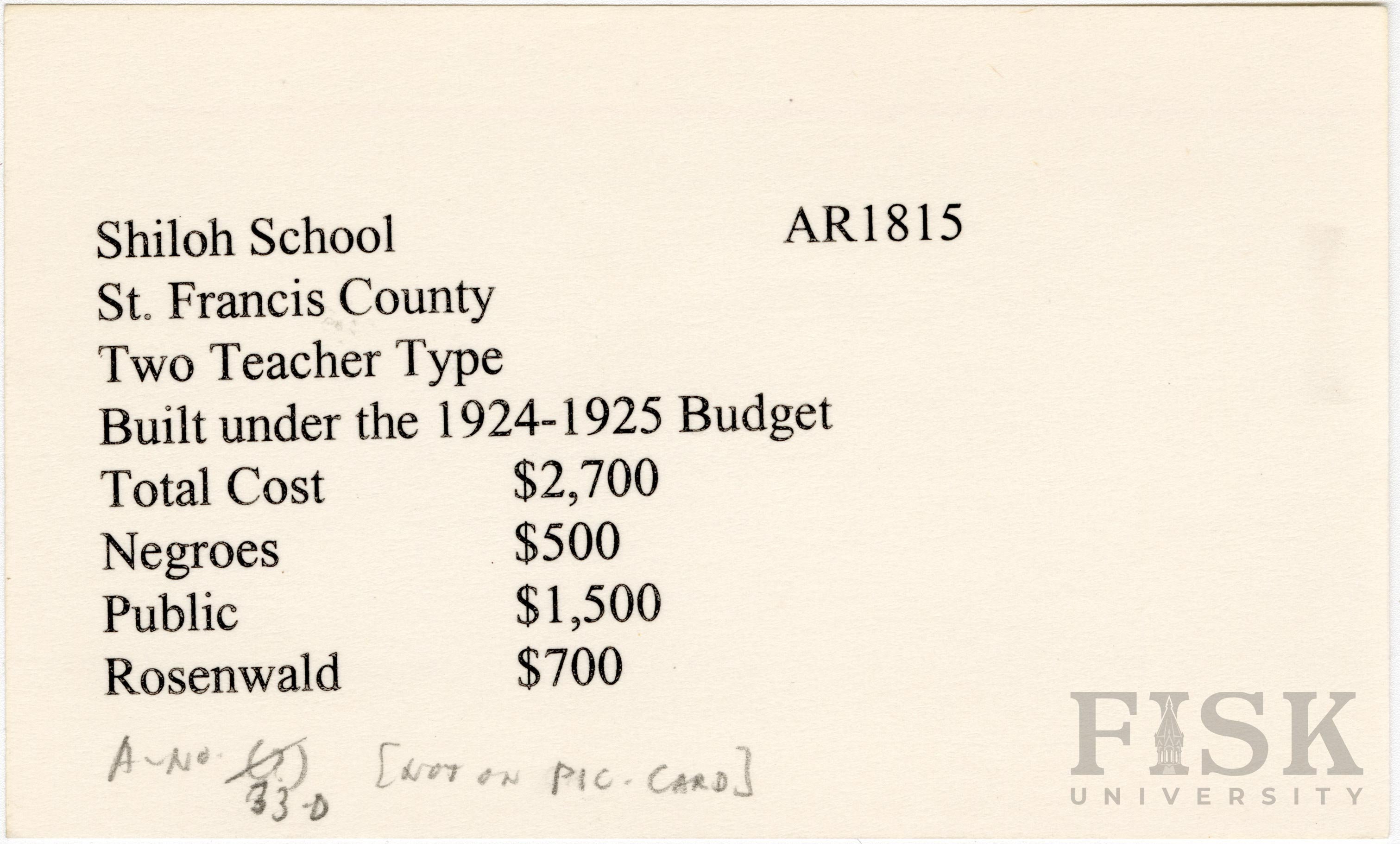 School card from Rosenwald Fund for Shiloh School in St. Francis County, Arkansas with a note next to the application number that says, "[not on pic card]"