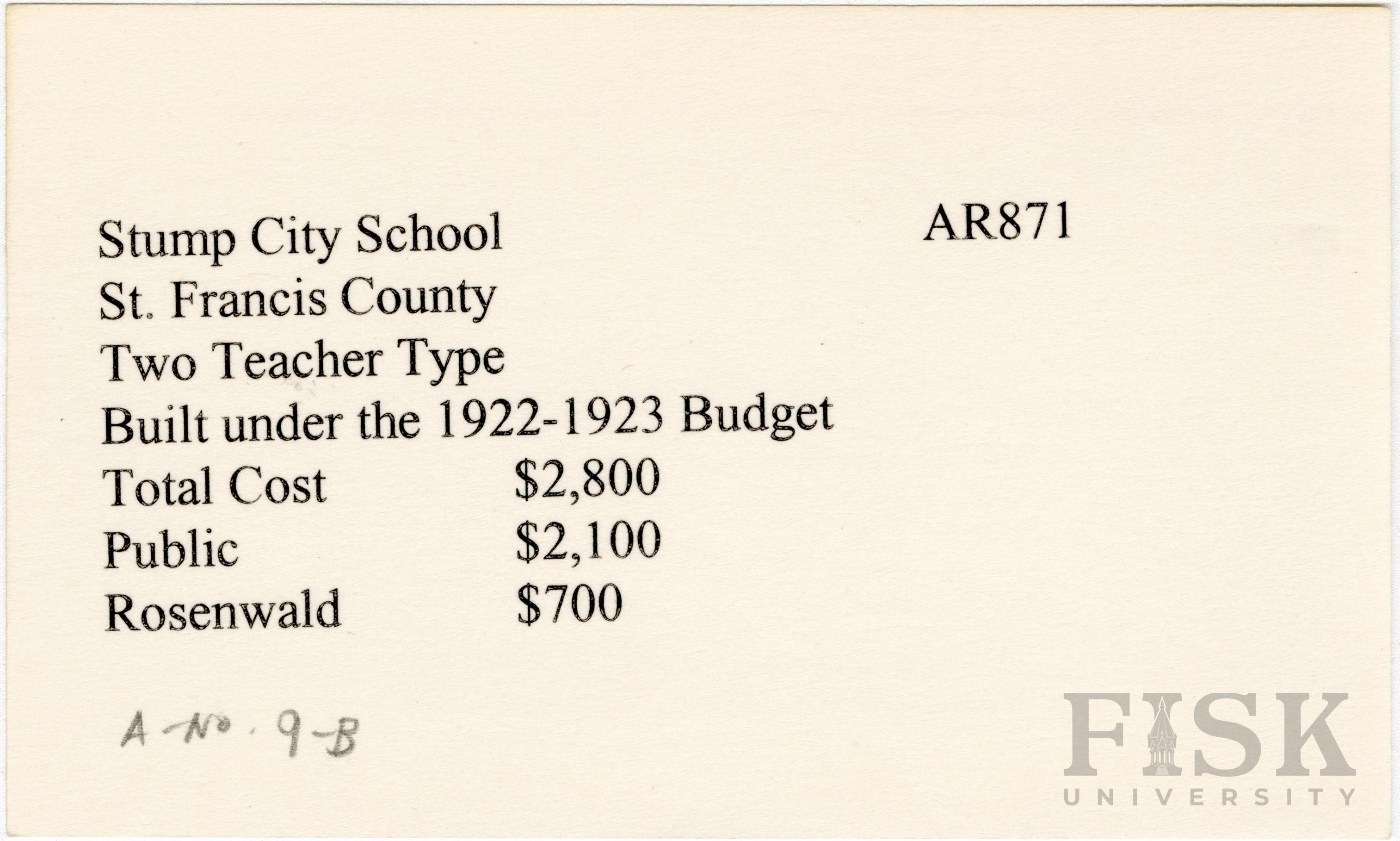 - School card from Rosenwald Fund for Stump City School in St. Francis County, Arkansas