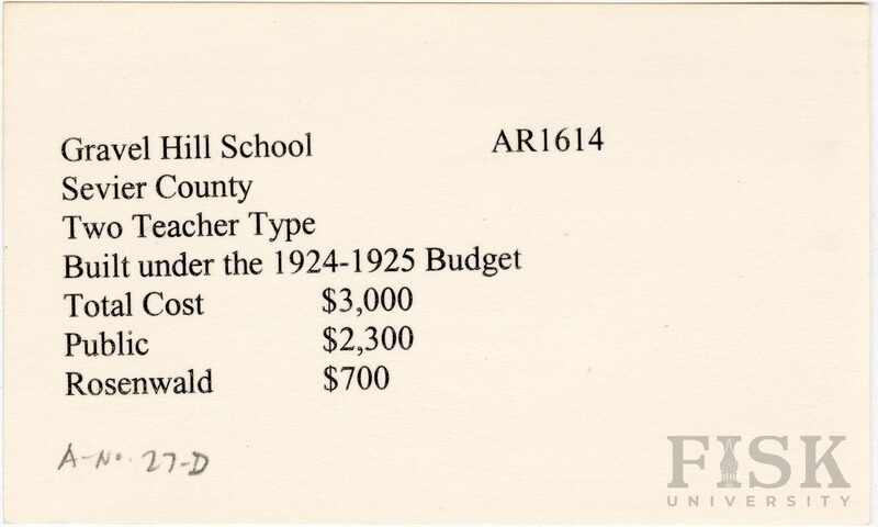 - Julius Rosenwald Fund--Buildings, African American schools--History--20th century, African American schools -- Gravel Hill School