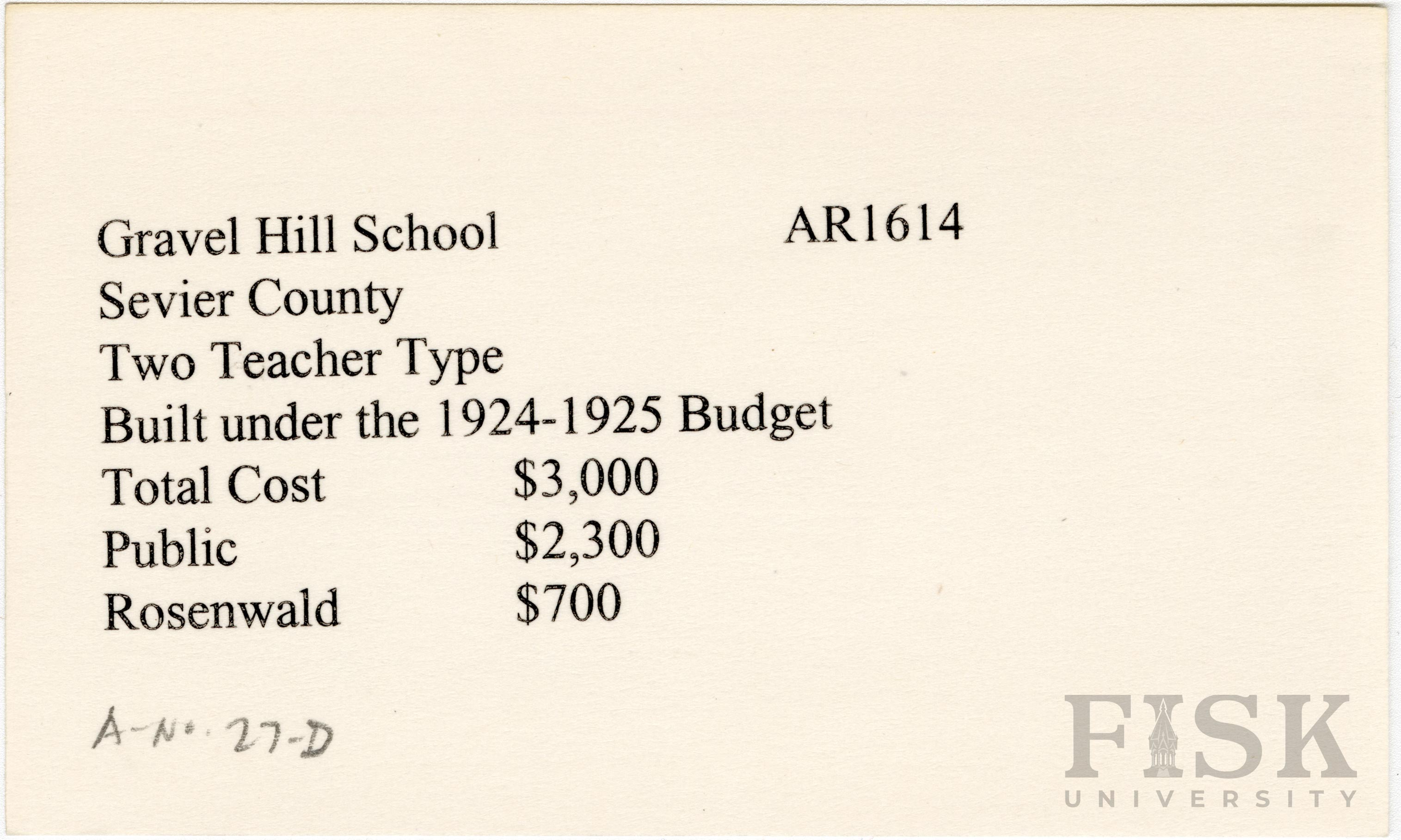 - School card from Rosenwald Fund for Gravel Hill School in Sevier County, Arkansas