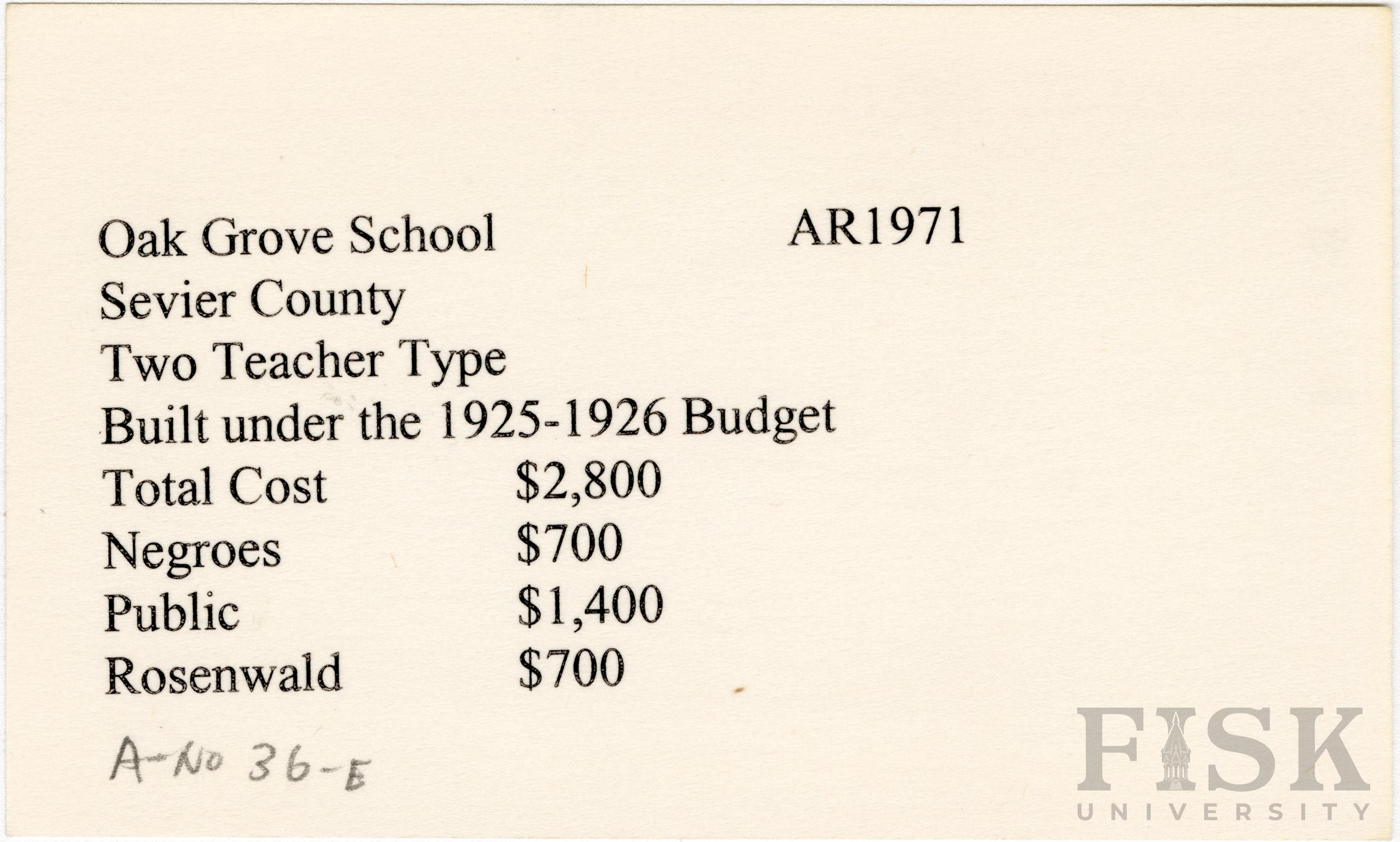- Julius Rosenwald Fund--Buildings, African American schools--History--20th century, African American schools -- Oak Grove School