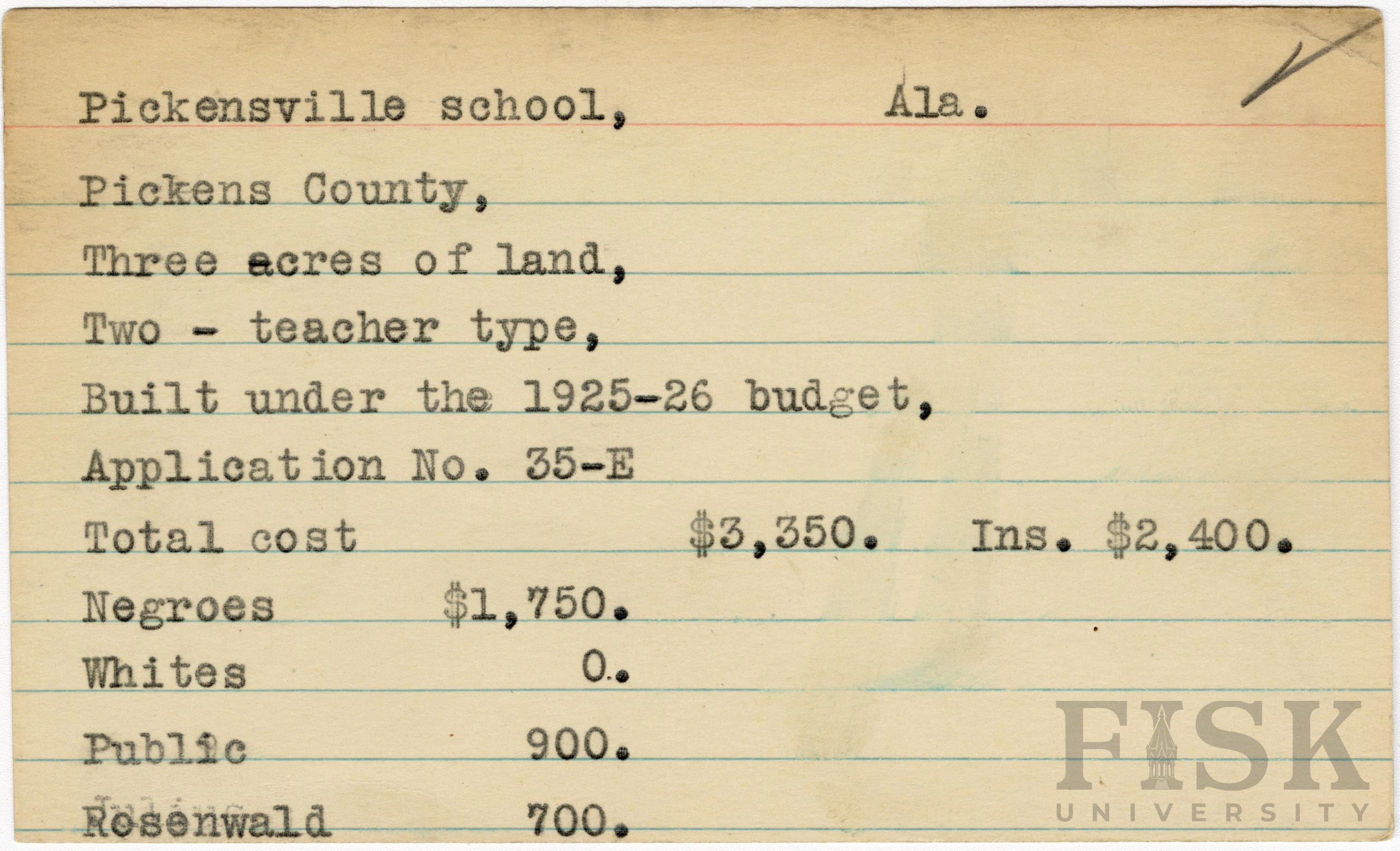 School card from Rosenwald Fund for Pickensville School in Pickens County, Alabama with a section added to the budget contributions that says, "Ins. $2,400".