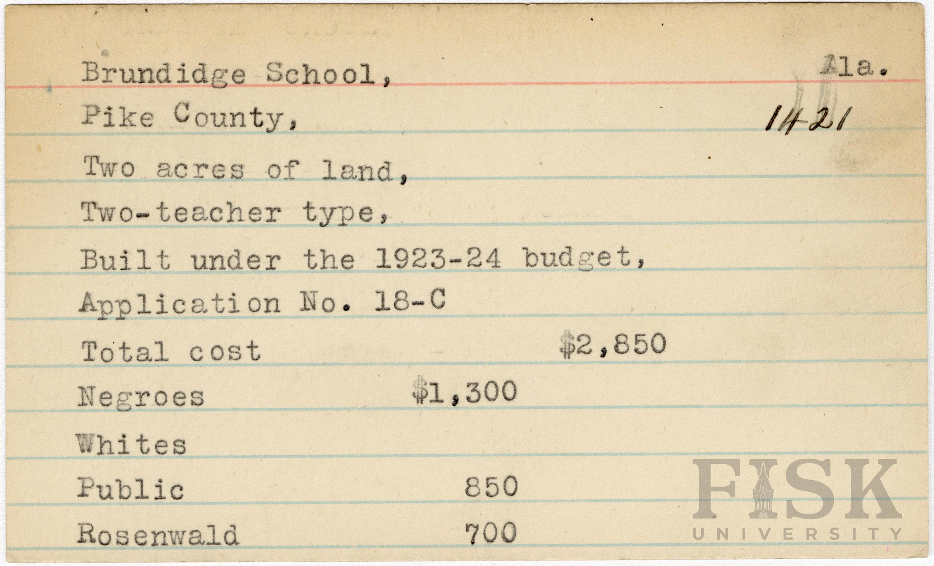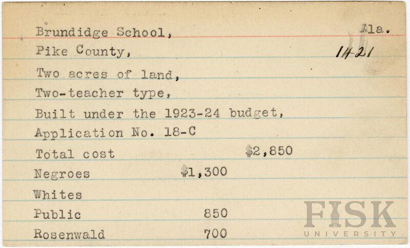 - School card from Rosenwald Fund for Brundidge School in Pike County, Alabama