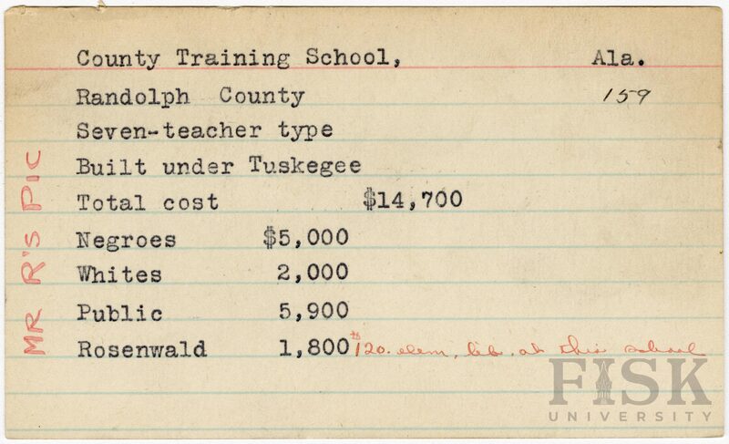 - School card from Rosenwald Fund for County Training School in Randolph County, Alabama with a note that says, "Mr. R's Pic" on the far left and a handwritten note that says, "120 elem lib at this school".