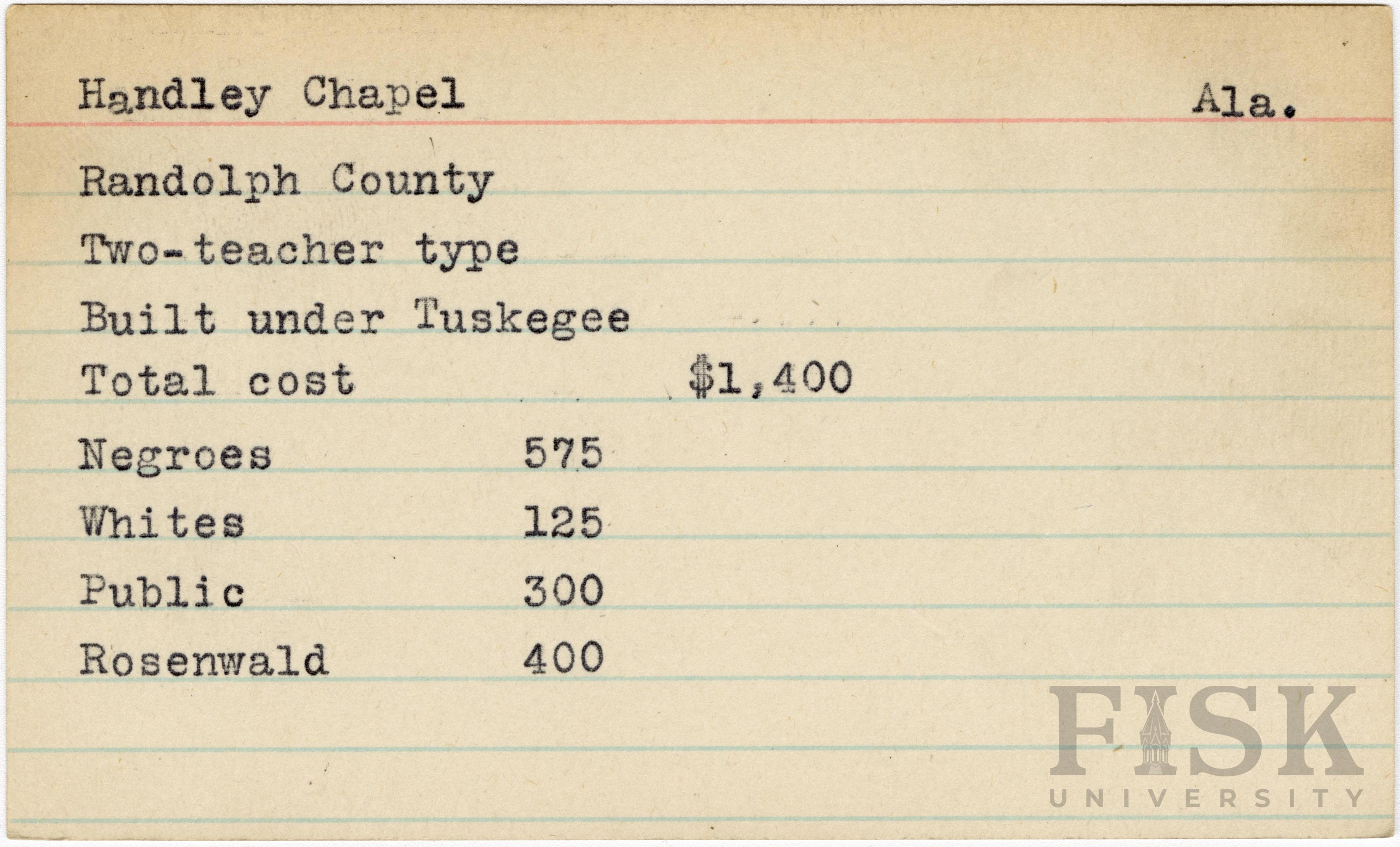 - School card from Rosenwald Fund for Handley Chapel School in Randolph County, Alabama