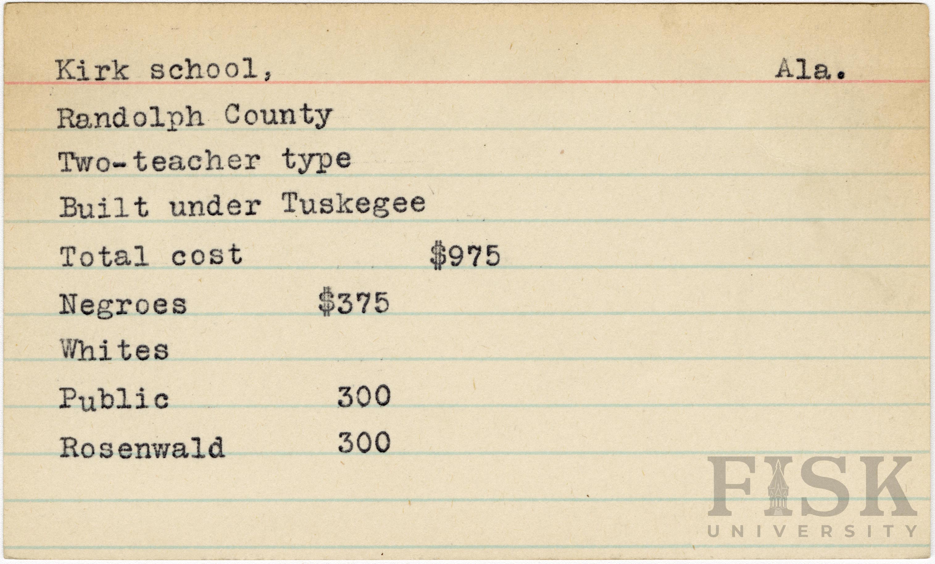 - School card from Rosenwald Fund for Kirk School in Randolph County, Alabama