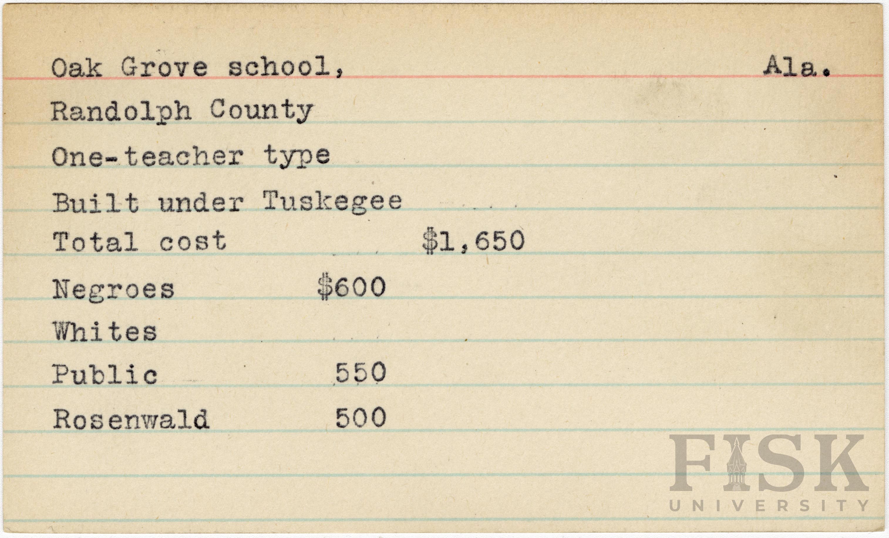 - School card from Rosenwald Fund for Oak Grove School in Randolph County, Alabama