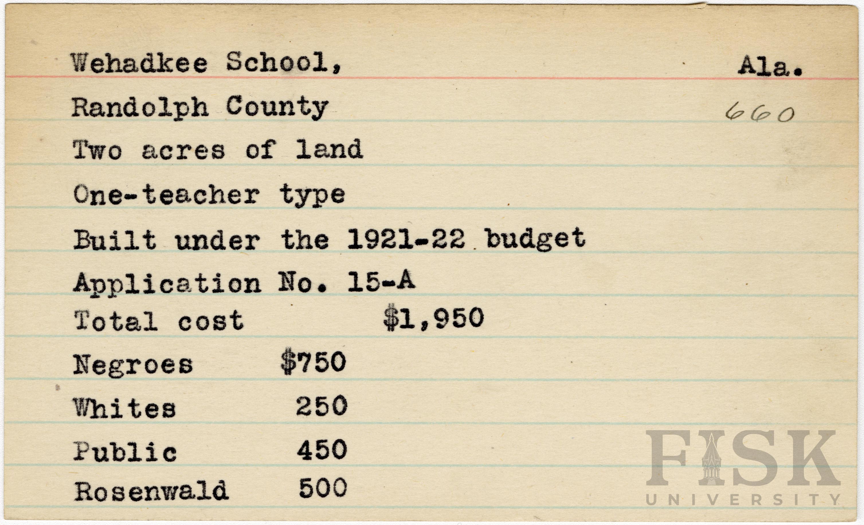 - School card from Rosenwald Fund for Wehadkee School in Randolph County, Alabama