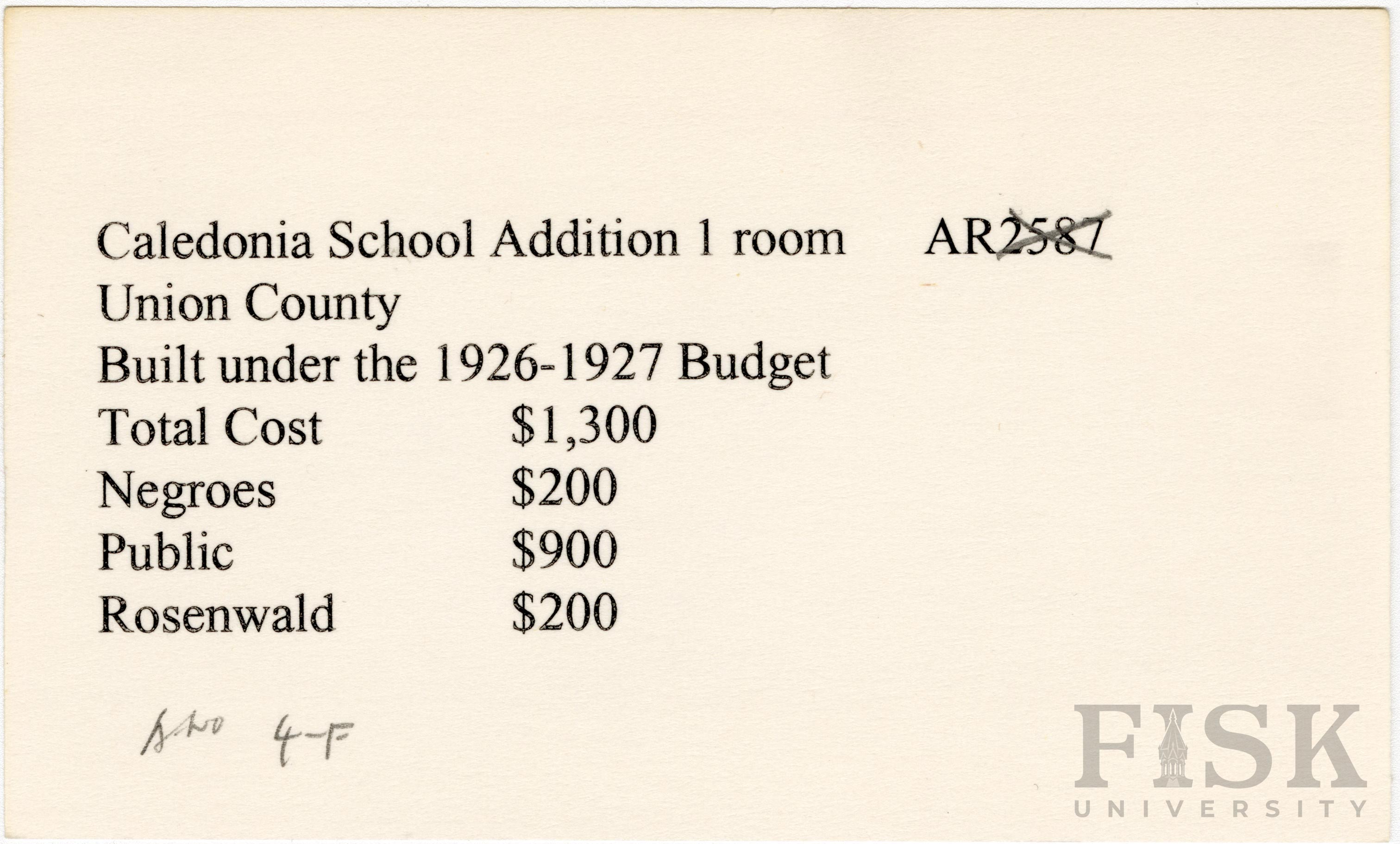 - School card from Rosenwald Fund for a one room addition to Caledonia School in Union County, Arkansas