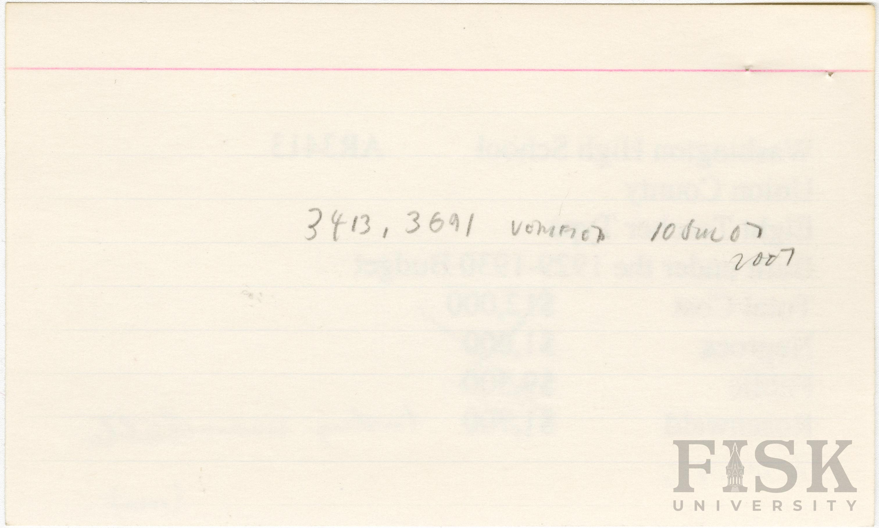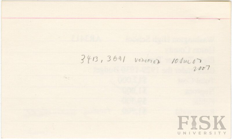 - School card from Rosenwald Fund for Washington High School in Union County, Arkansas with the budget contributions crossed out with a note that says, "[unclear] unavailable"