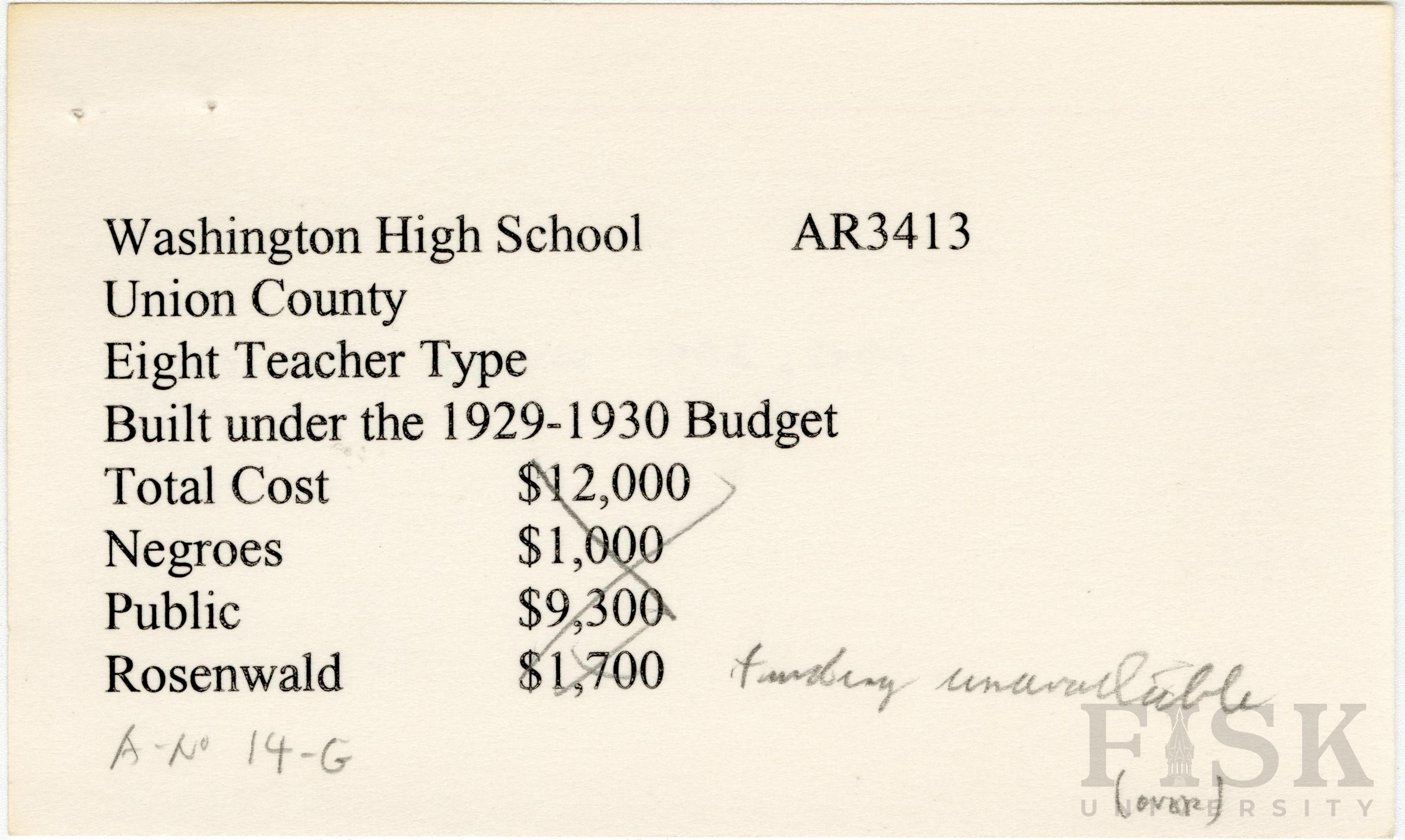 School card from Rosenwald Fund for Washington High School in Union County, Arkansas with the budget contributions crossed out with a note that says, "[unclear] unavailable"