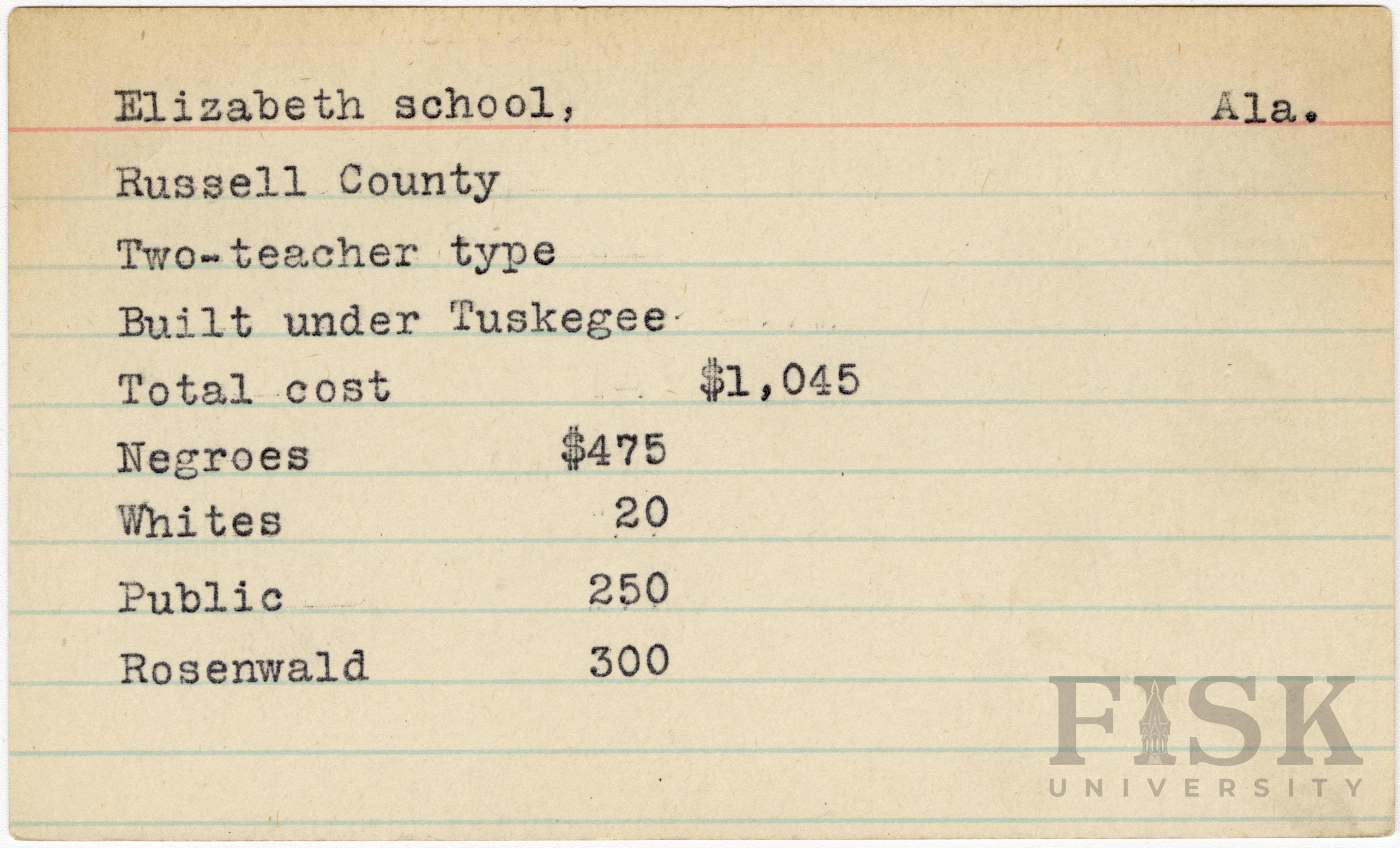- School card from Rosenwald Fund for Elizabeth School in Russell County, Alabama