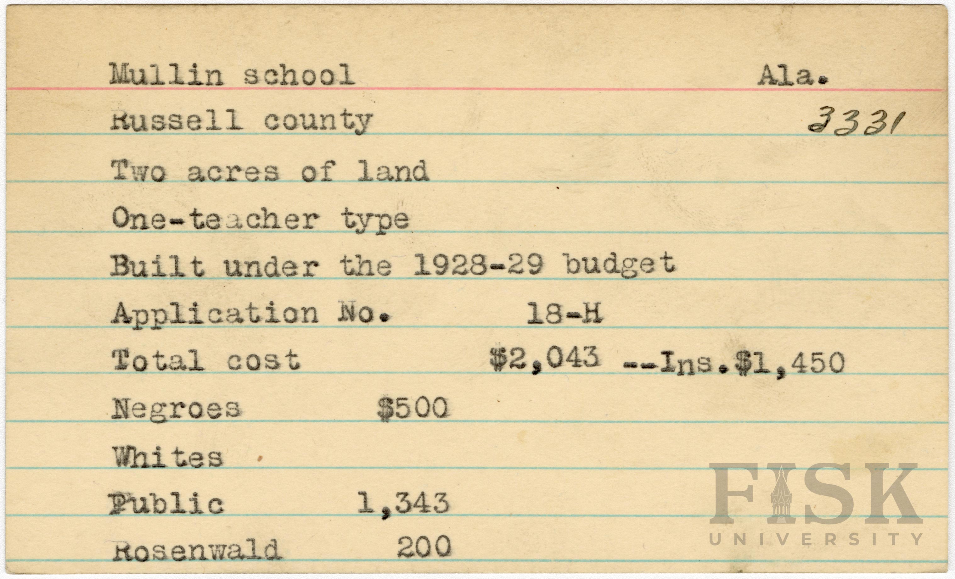 School card from Rosenwald Fund for Mullin School in Russell County, Alabama with a section added to the budget contributions that says, "Ins. $1,450"