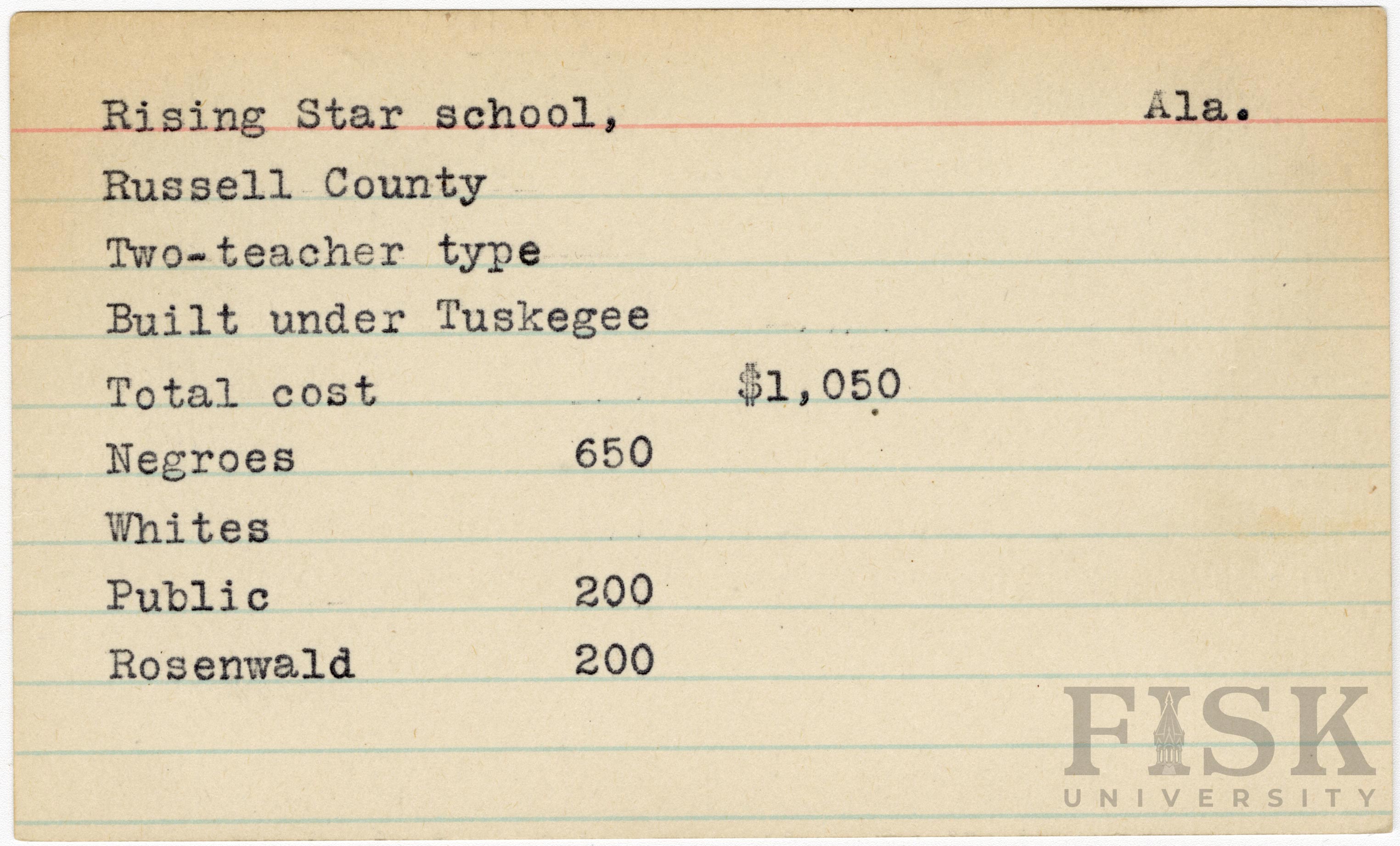 - School card from Rosenwald Fund for Rising Star School in Russell County, Alabama