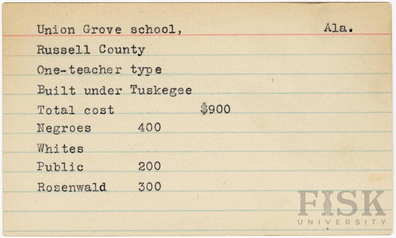 - School card from Rosenwald Fund for Union Grove School in Russell County, Alabama