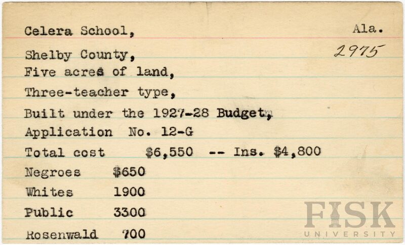 - School card from Rosenwald Fund for Celera School in Shelby County, Alabama with a section added to the budget contributions that says, "Ins. $4800"