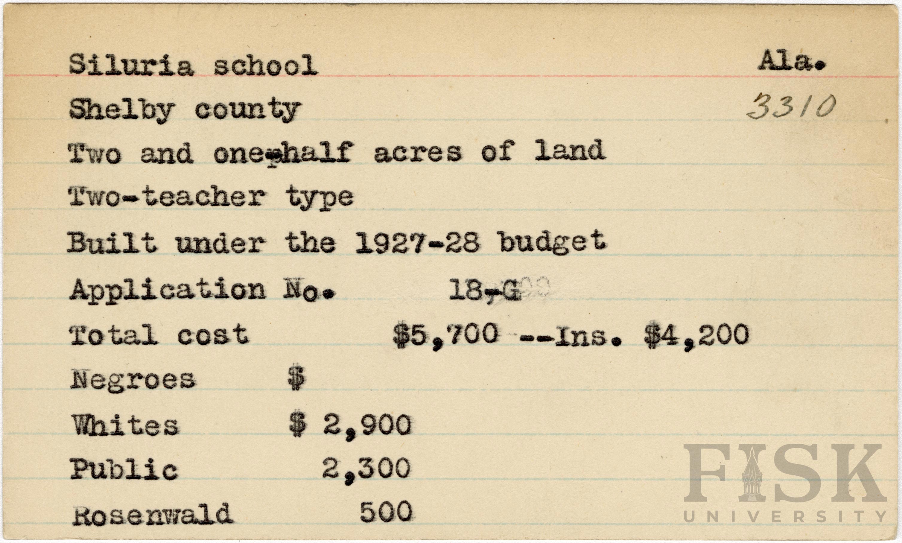 - School card from Rosenwald Fund for Siluria School in Shelby County, Alabama with a section added to the budget contributions that says, "Ins. $4,200"