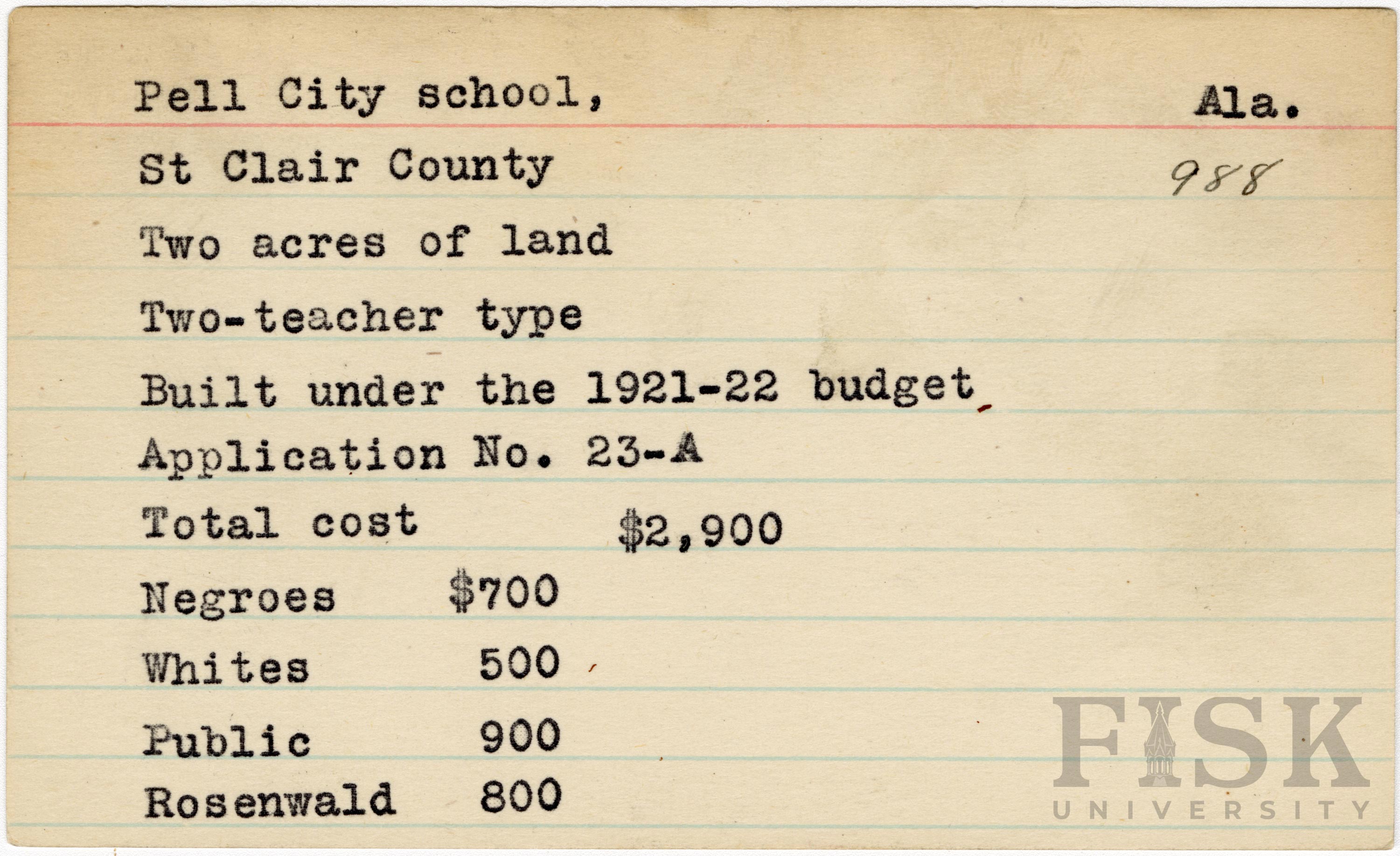 - School card from Rosenwald Fund for Pell City School in St. Clair County, Alabama