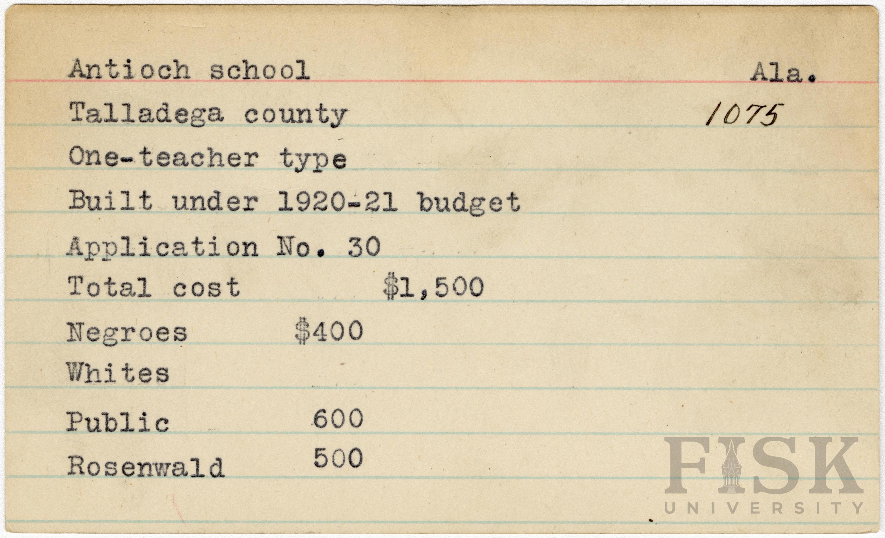 - School card from Rosenwald Fund for Antioch School in Talladega County, Alabama