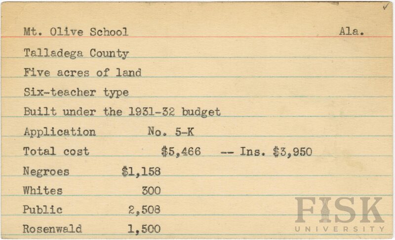 School card from Rosenwald Fund for Mt. Olive School in Talladega County, Alabama with a section added to the budget contributions that says, "Ins. $3,950"