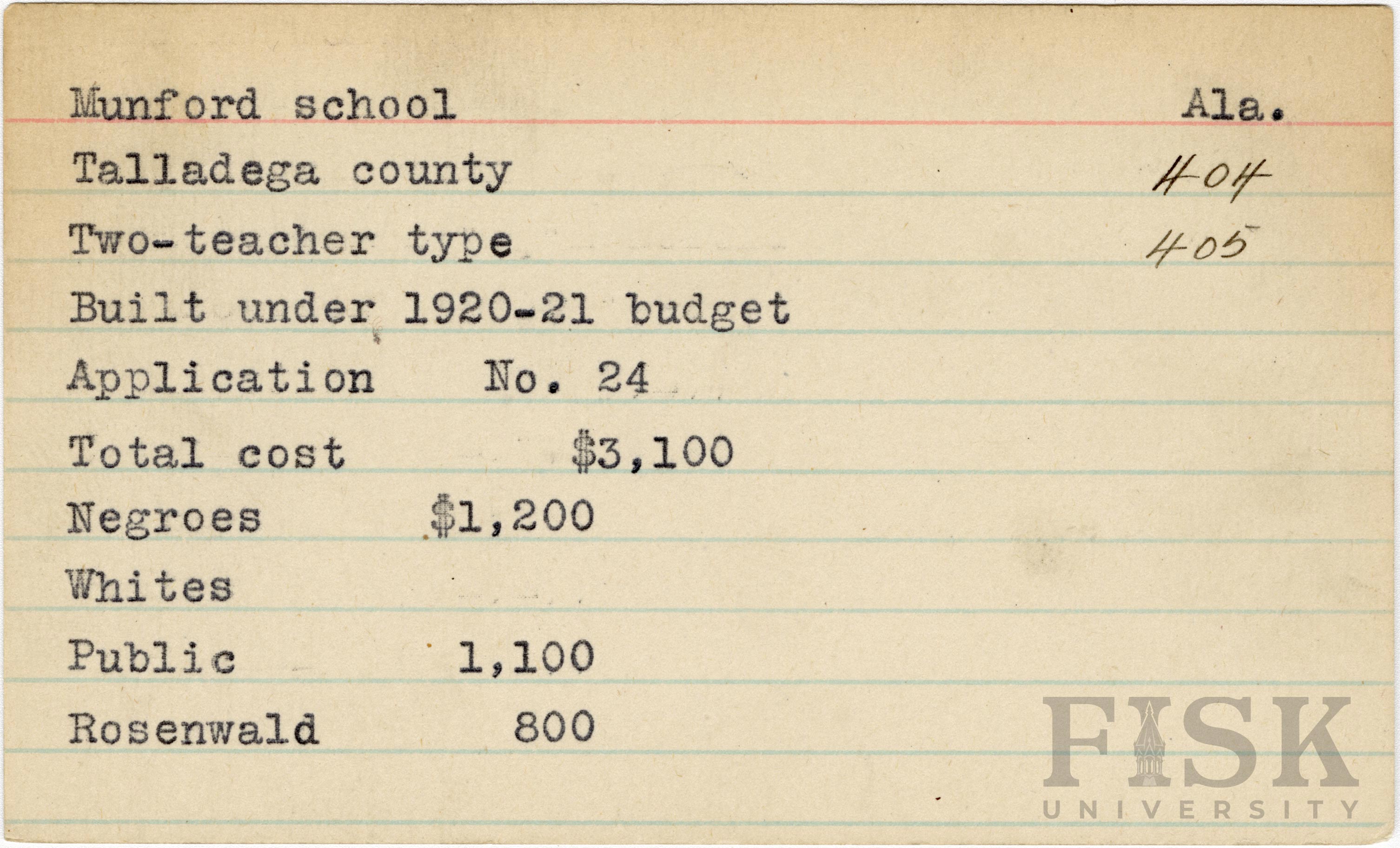 - School card from Rosenwald Fund for Munford School in Talladega County, Alabama