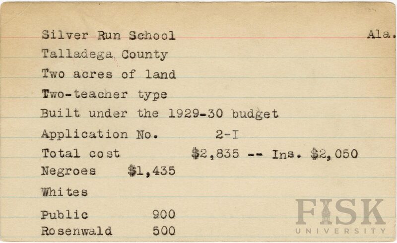 - School card from Rosenwald Fund for Silver Run School in Talladega County, Alabama with a section added to the budget contributions that says, "Ins. $2,050"