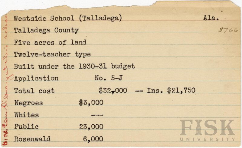 - School card from Rosenwald Fund for Westside School in Talladega County, Alabama with a section added to the budget contributions that says, "Ins. $21,750" and a handwritten note on the far left that says, "$120 elem. Library at this school."