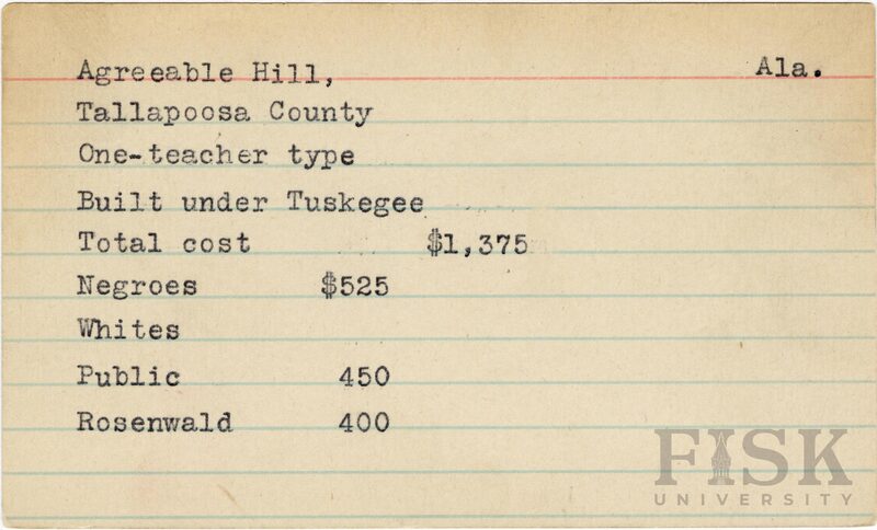 - School card from Rosenwald Fund for Agreeable Hill School in Tallapoosa County, Alabama