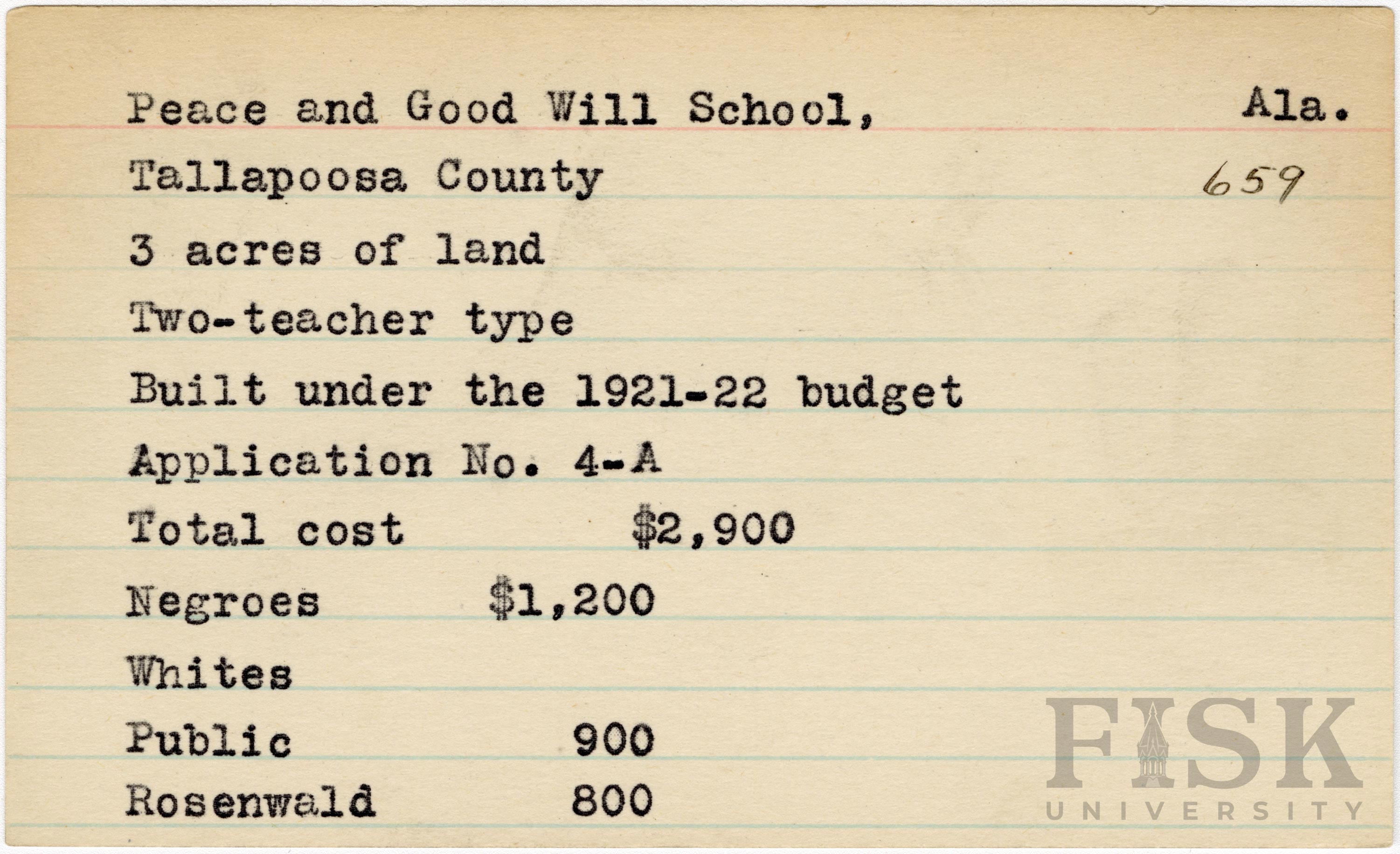 - School card from Rosenwald Fund for Peace and Good Will School in Tallapoosa County, Alabama
