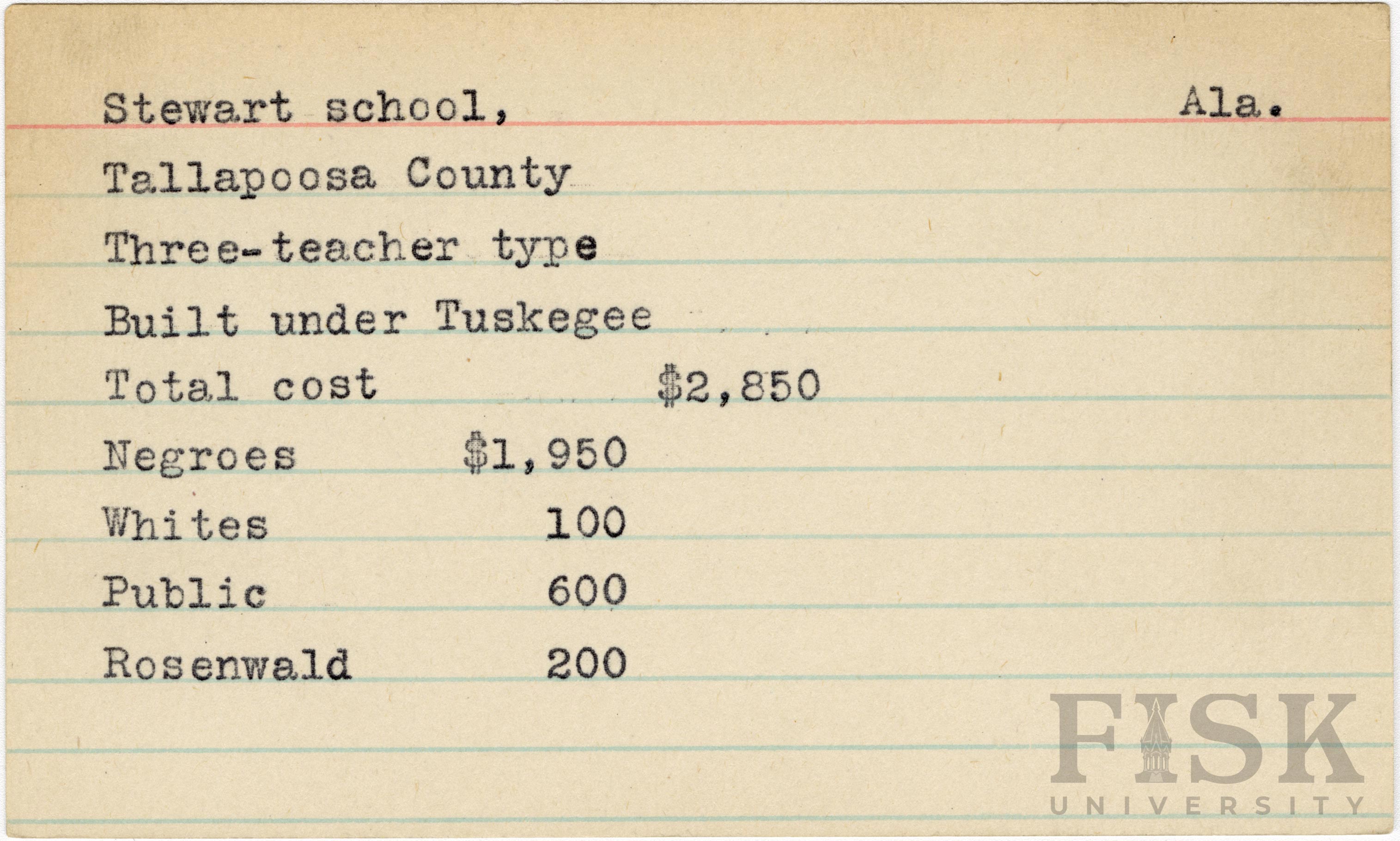 - School card from Rosenwald Fund for Stewart School in Tallapoosa County, Alabama