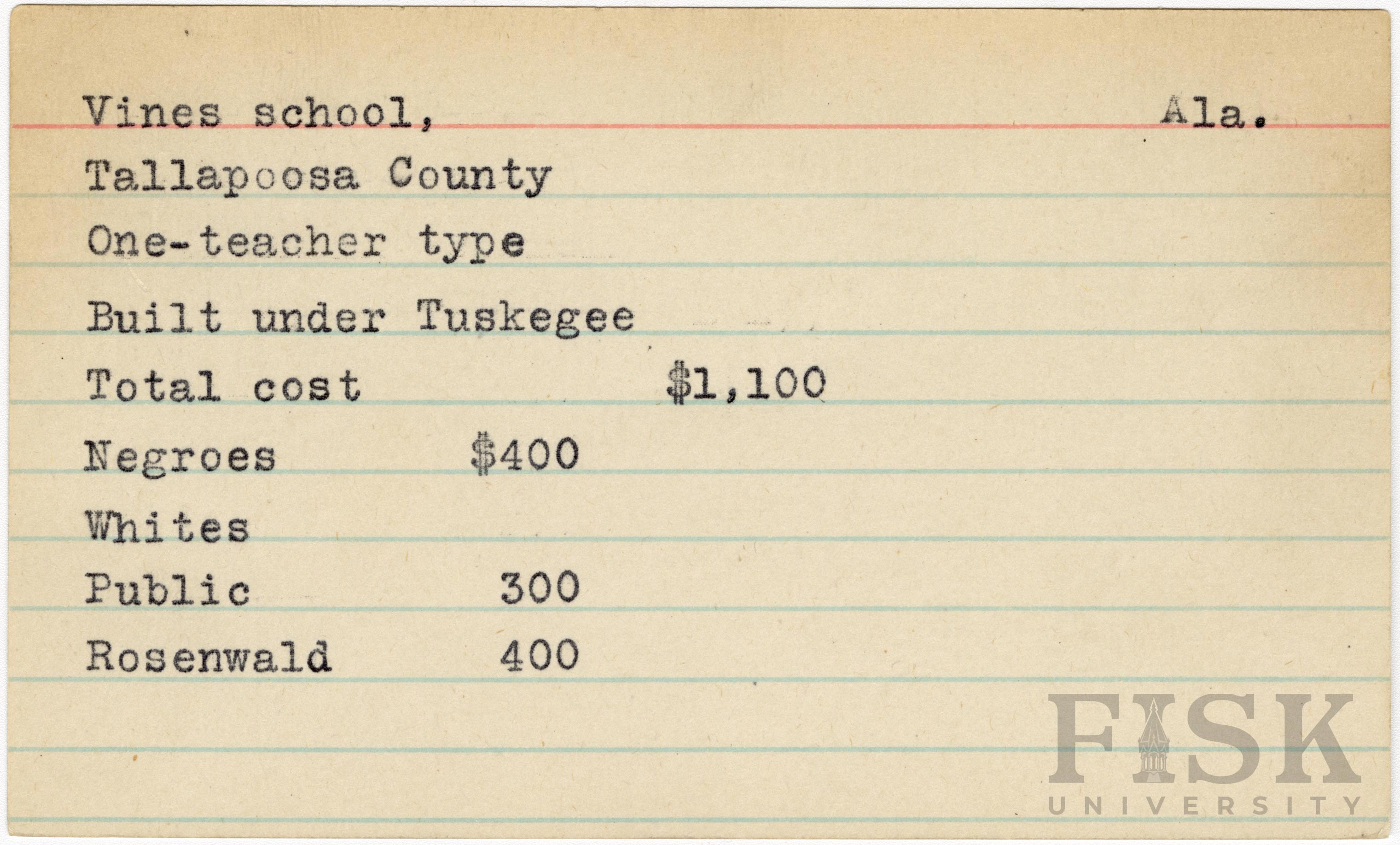 - School card from Rosenwald Fund for Vines School in Tallapoosa County, Alabama
